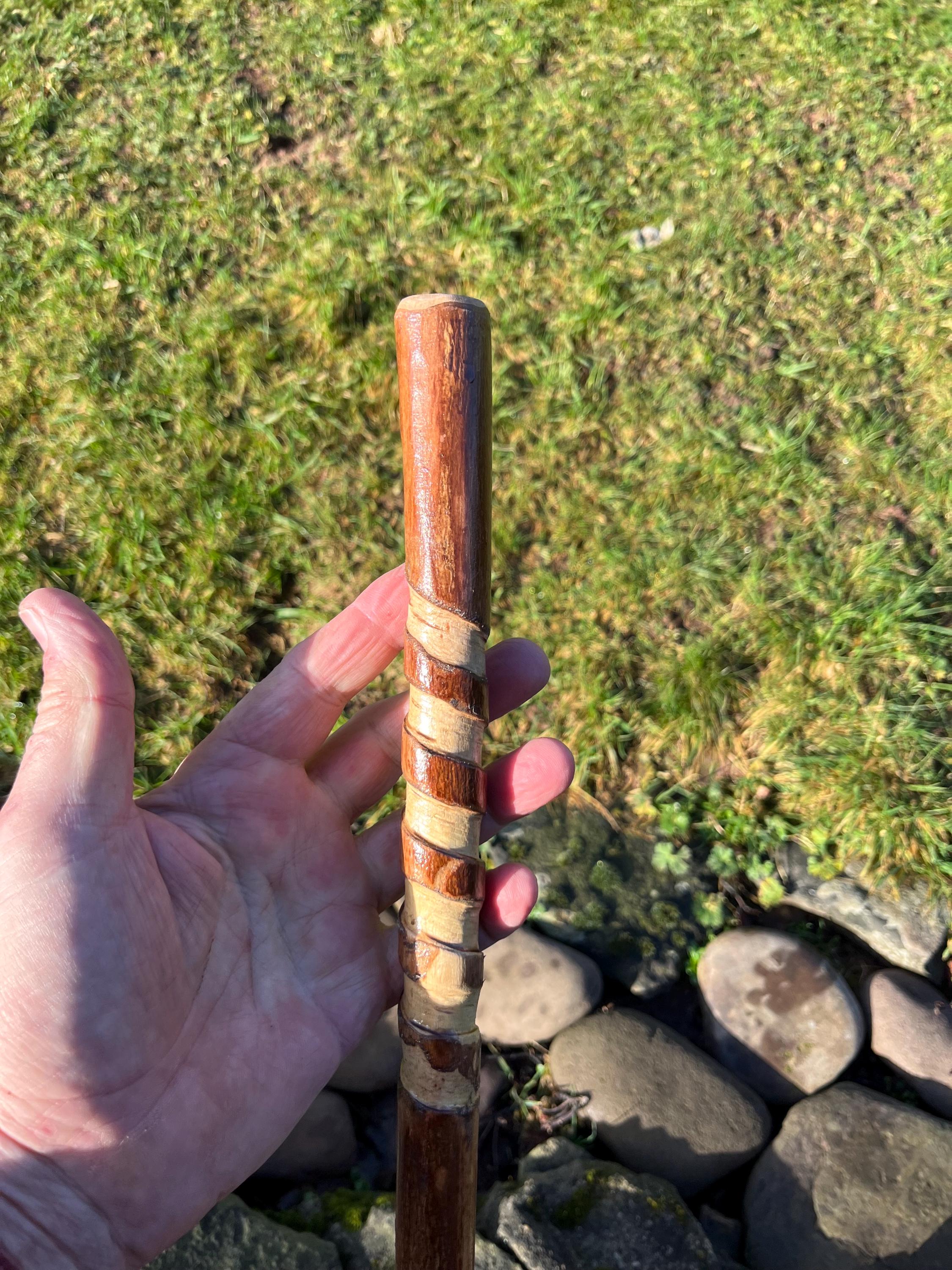 "A unique 45\" hazel hiking stick with a spiral hand carved into its highly polished shaft...