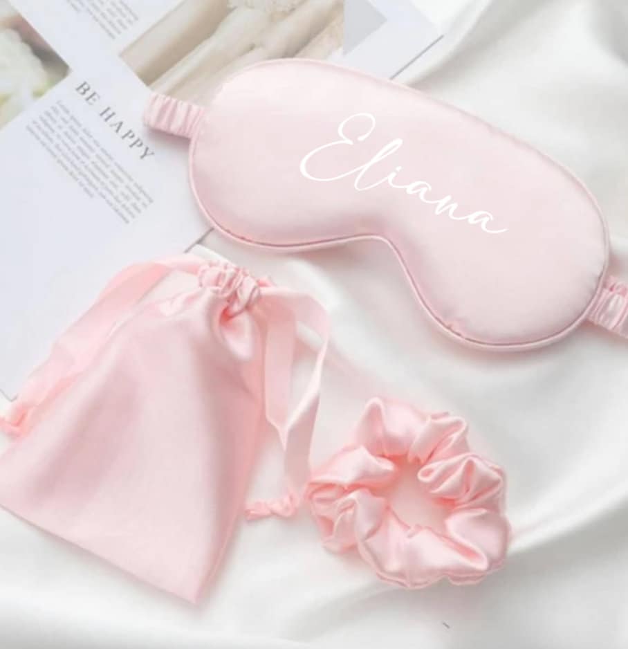 Beautiful eye mask and scrunchie set available in 4 colours! Personalise with a name or initials for...