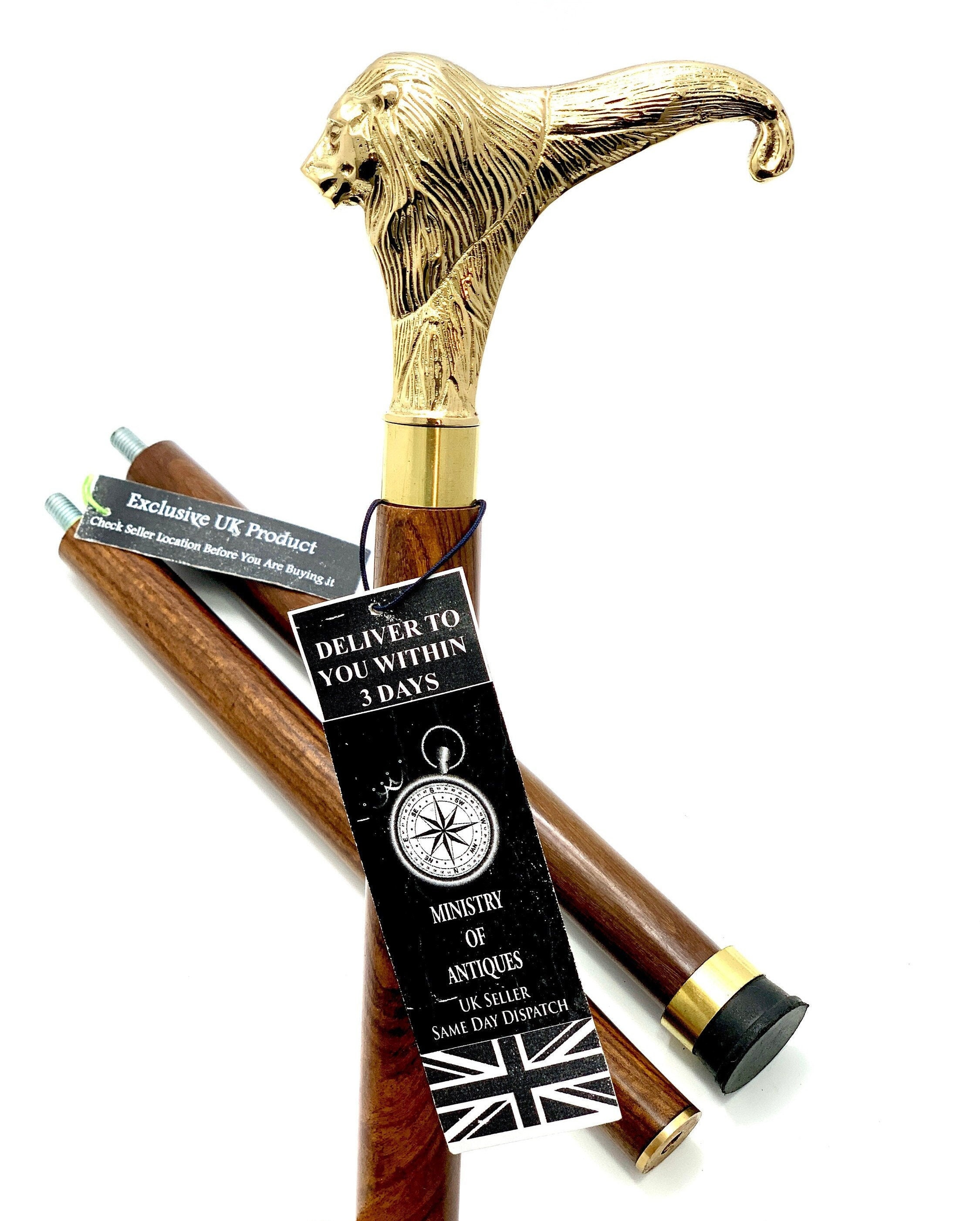 Lion Handle Solid Brass Stylish Hard Wood Folding Walking Stick Vin...