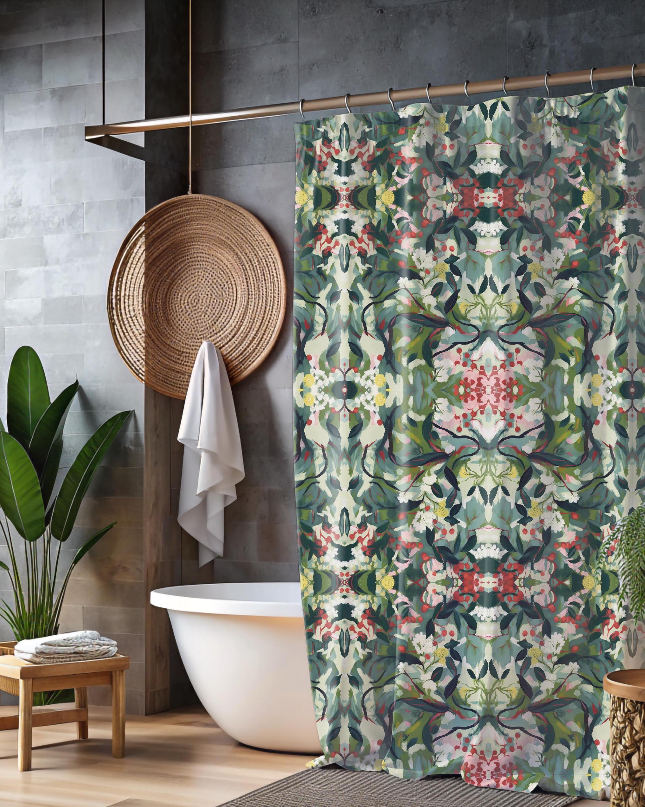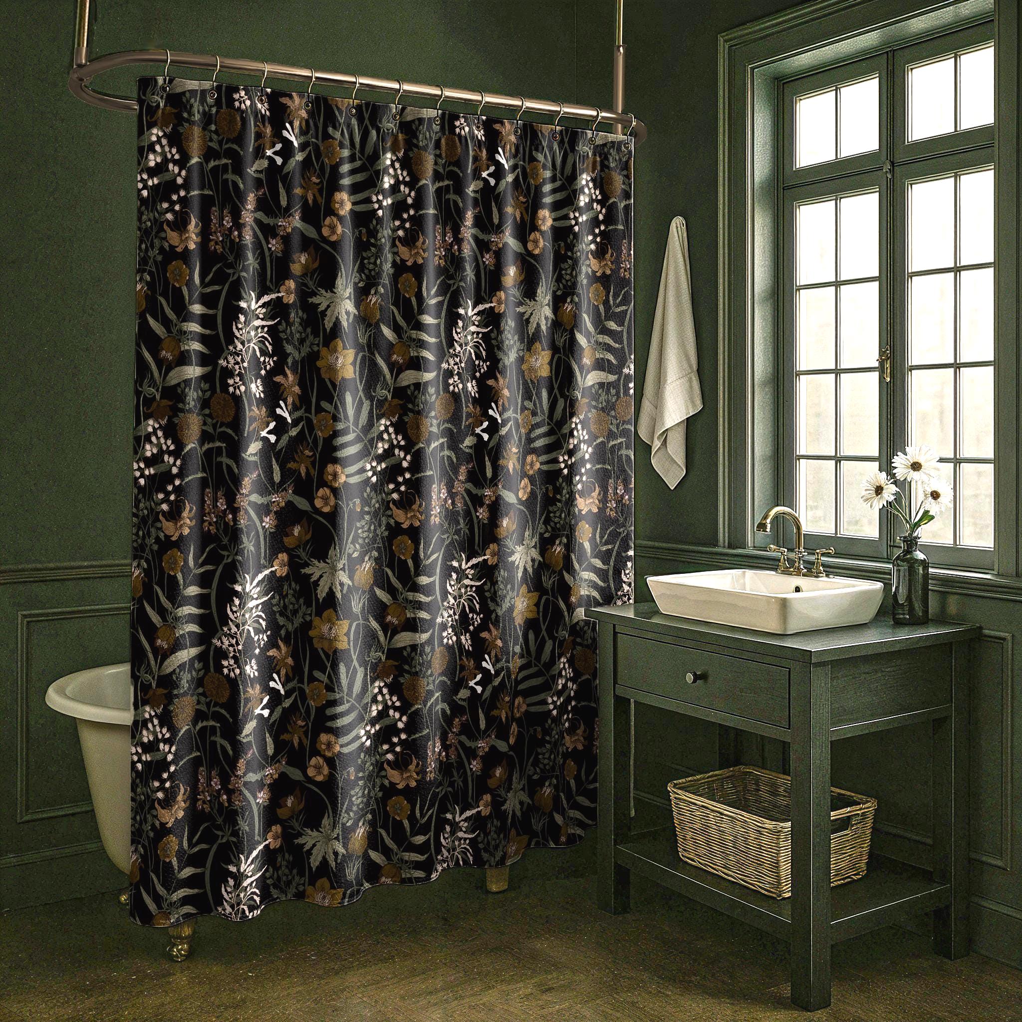 "Dark green foliage shower curtain with dark vintage wildflower pattern. Made of a washable lig...