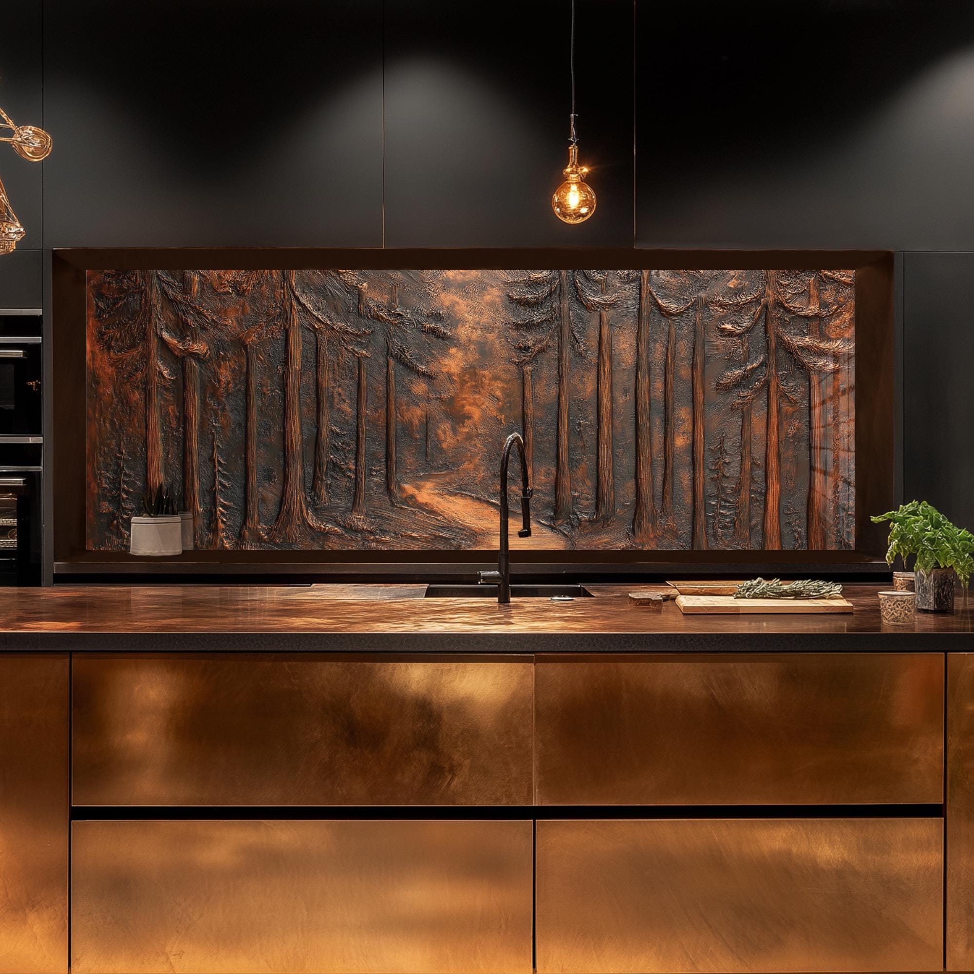 Copper Pine Tree Glass Backsplash, Stove Back Top Cover, Kitchen Si...