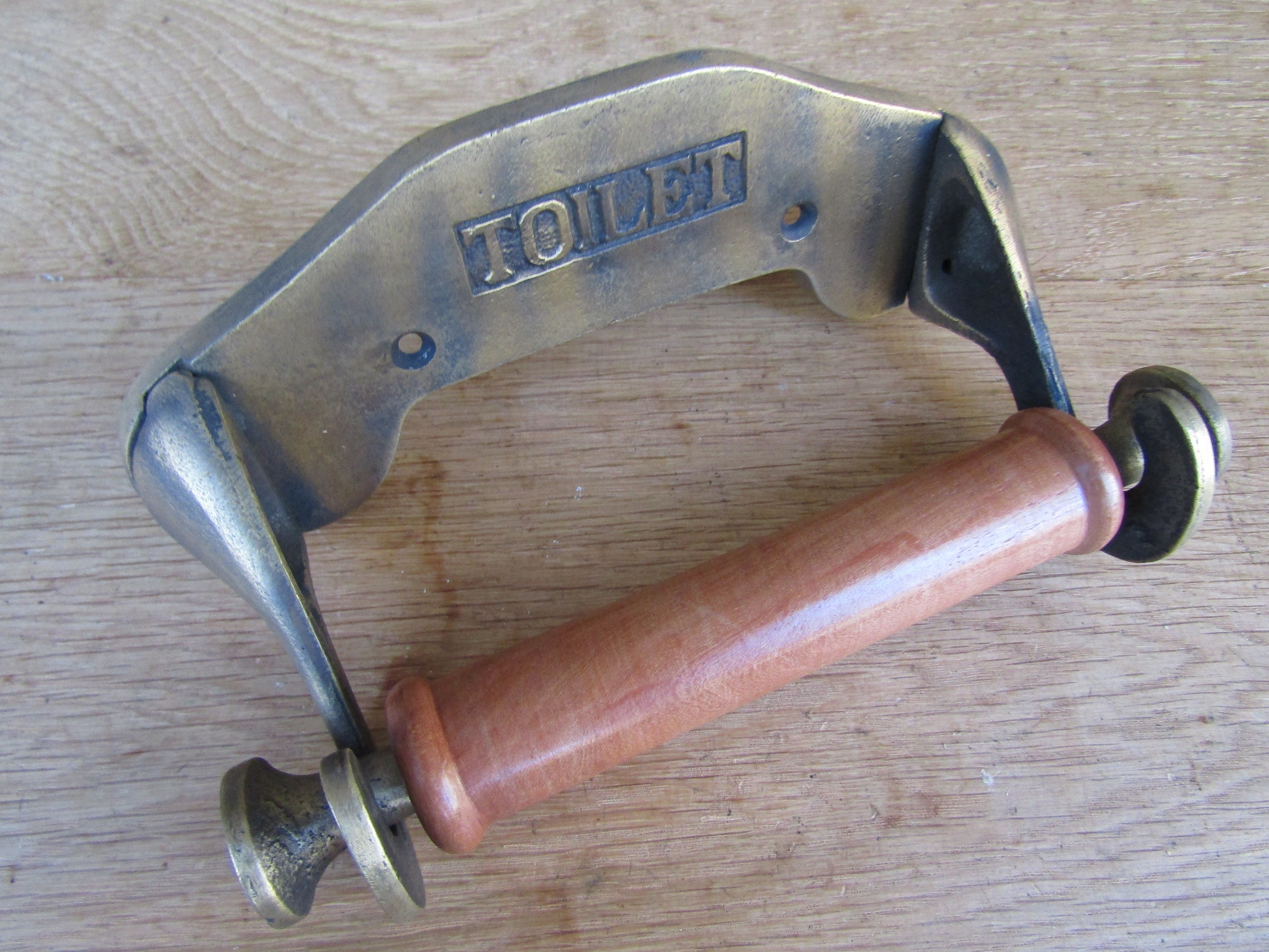 A FANTASTIC REPRODUCTION EDWARDIAN TOILET ROLL HOLDER MADE FROM CAST IRON WITH A SOLID TEAK BAR IT M...