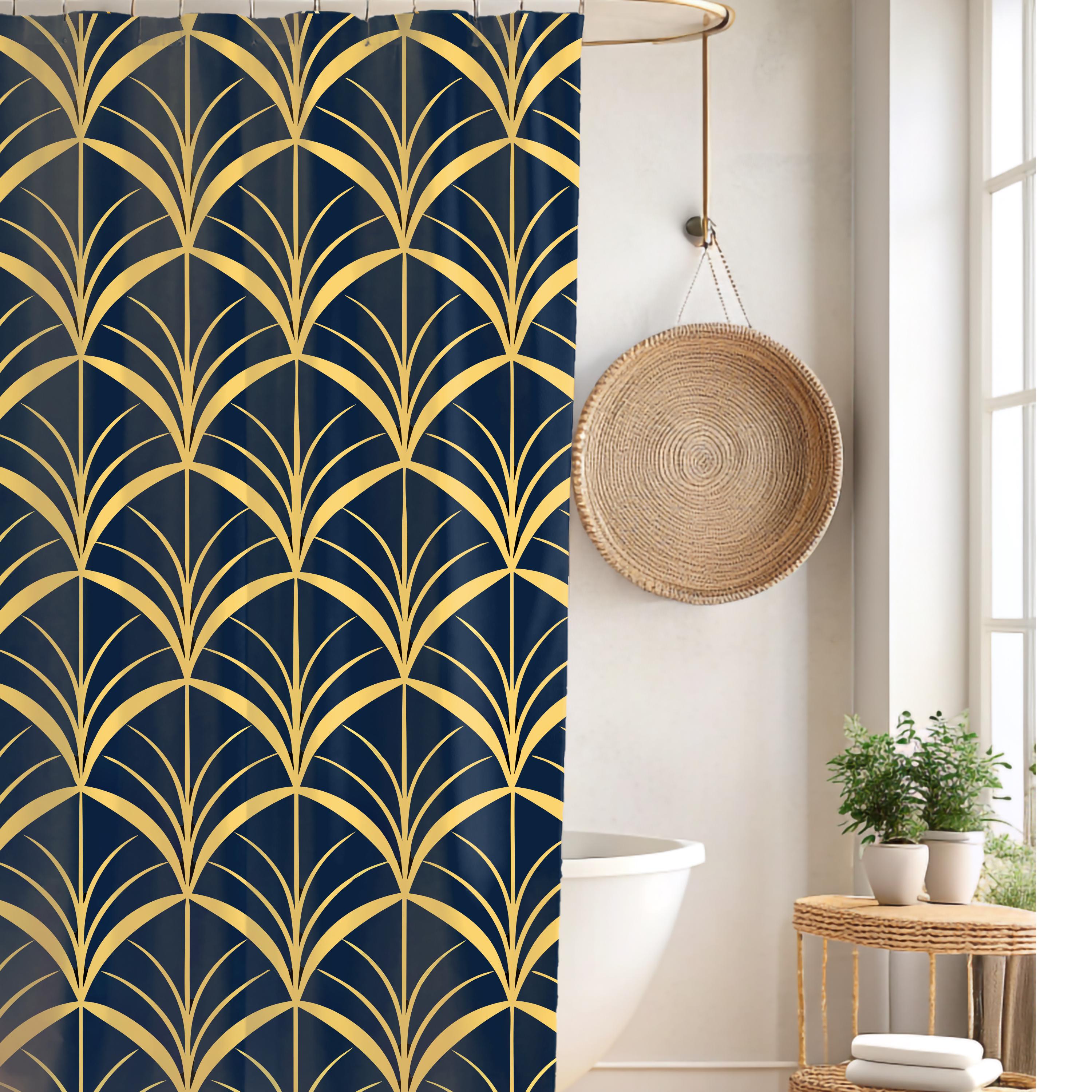 "Elevate your bathroom with this navy and gold Art Deco shower curtain. Featuring a bold geomet...