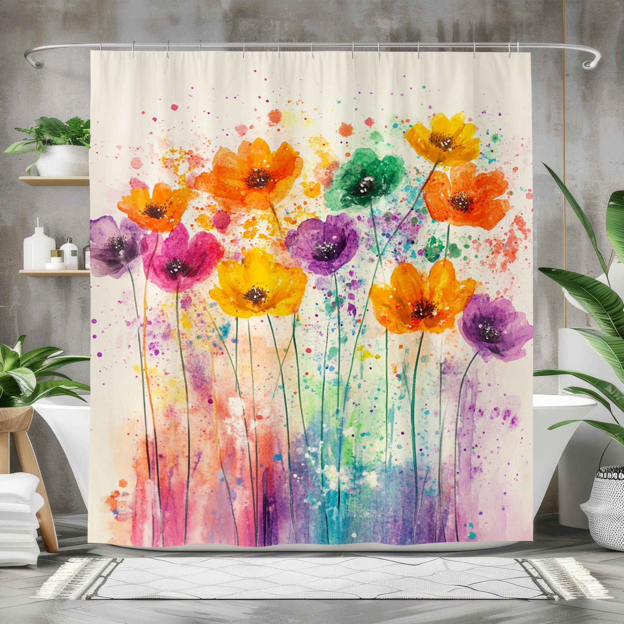 Brighten your bathroom with this artistic floral shower curtain featuring a vibrant watercolor desig...