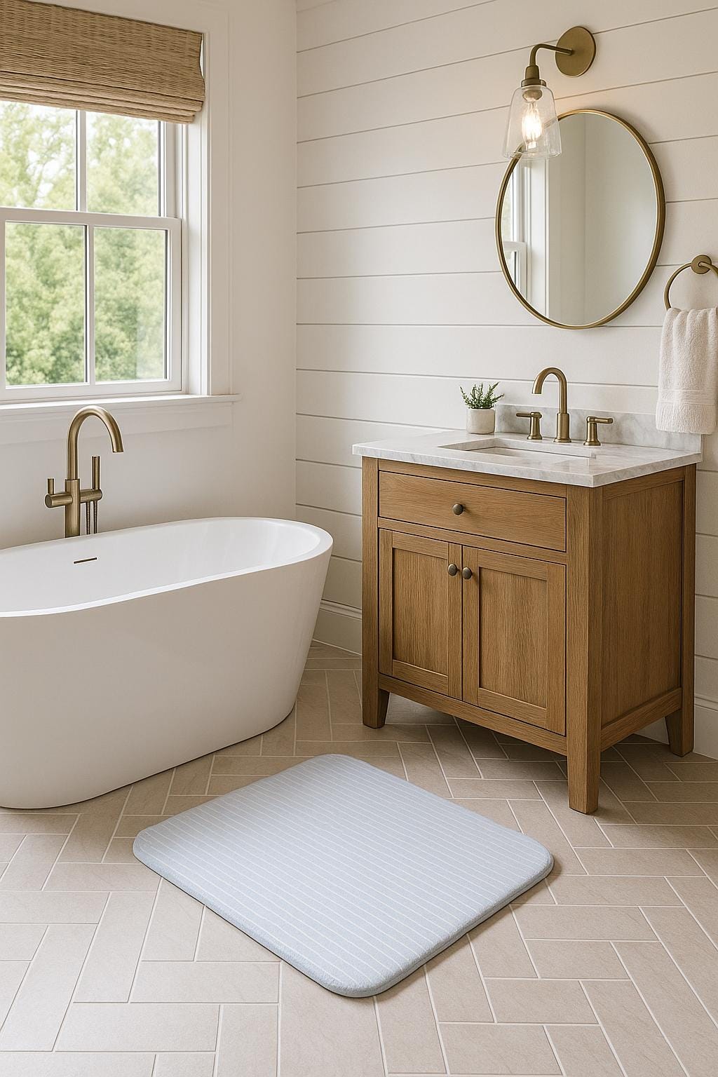 Light Blue Striped Bath Mat - Memory Foam Anti-Slip Bathroom Rug, C...
