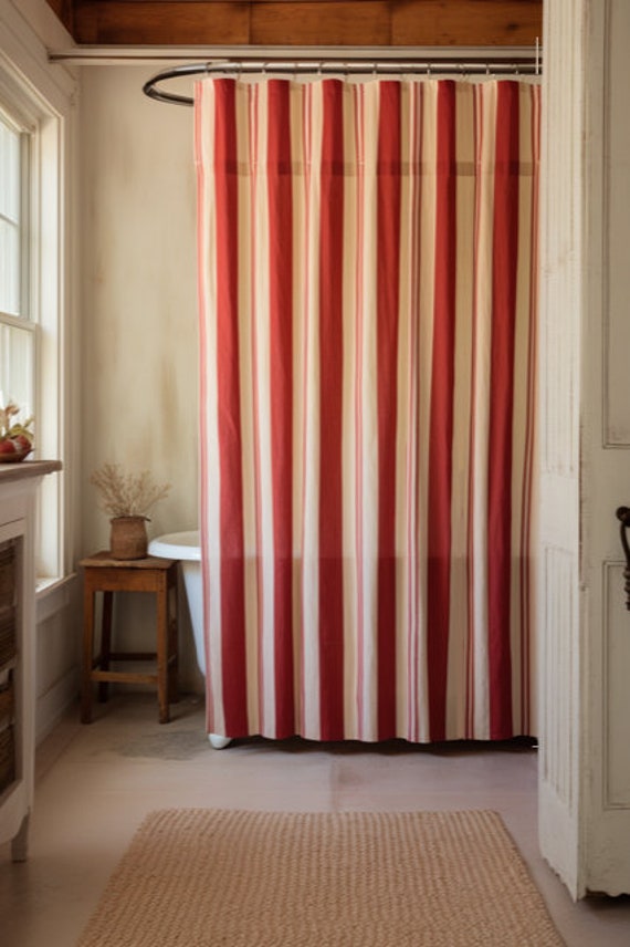 Cottage Decor Shower Curtain Red Cream Striped Bath Curtain Bathroo...