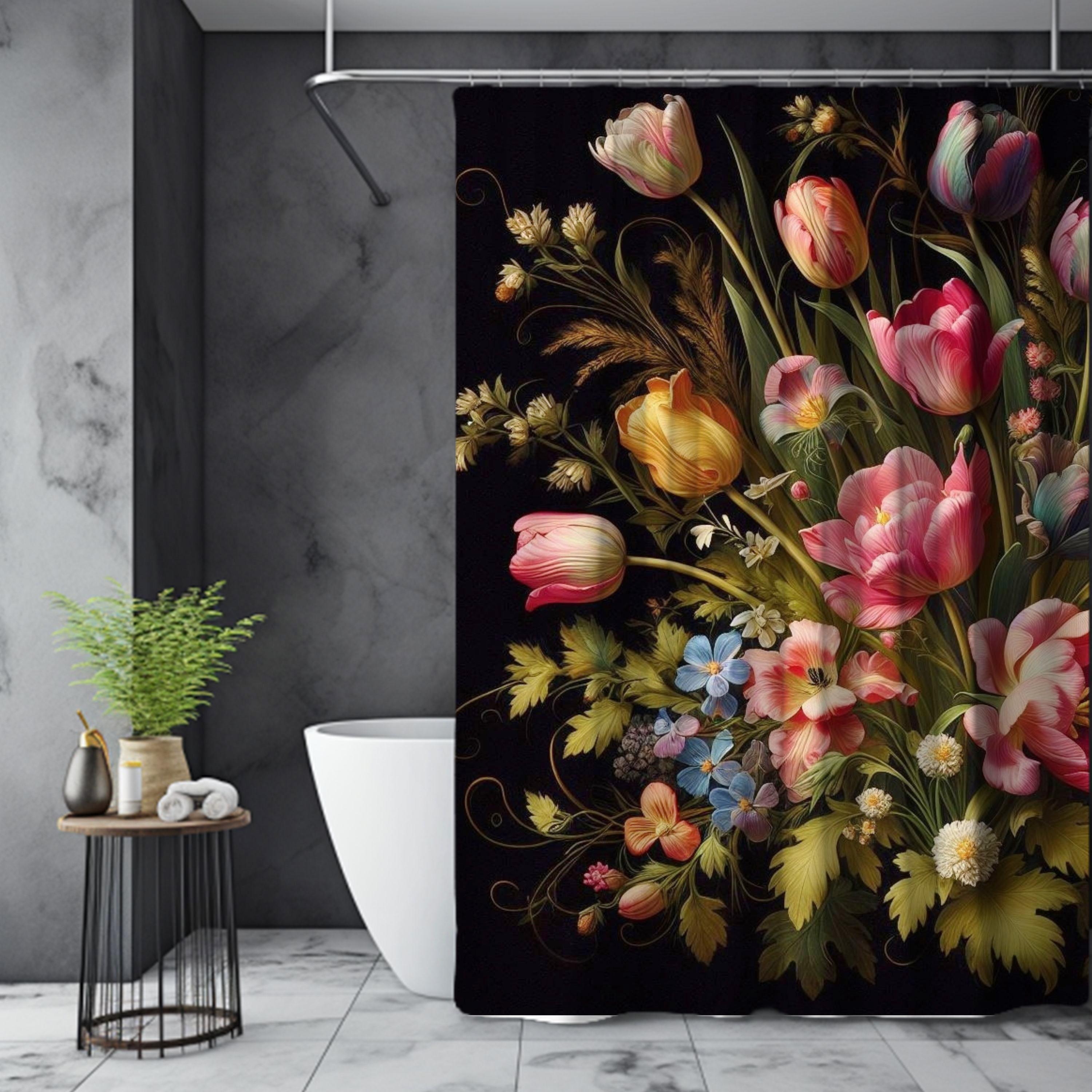 Dark Floral Shower Curtain Vintage Tulips Bathroom Decor Dark Cotta...