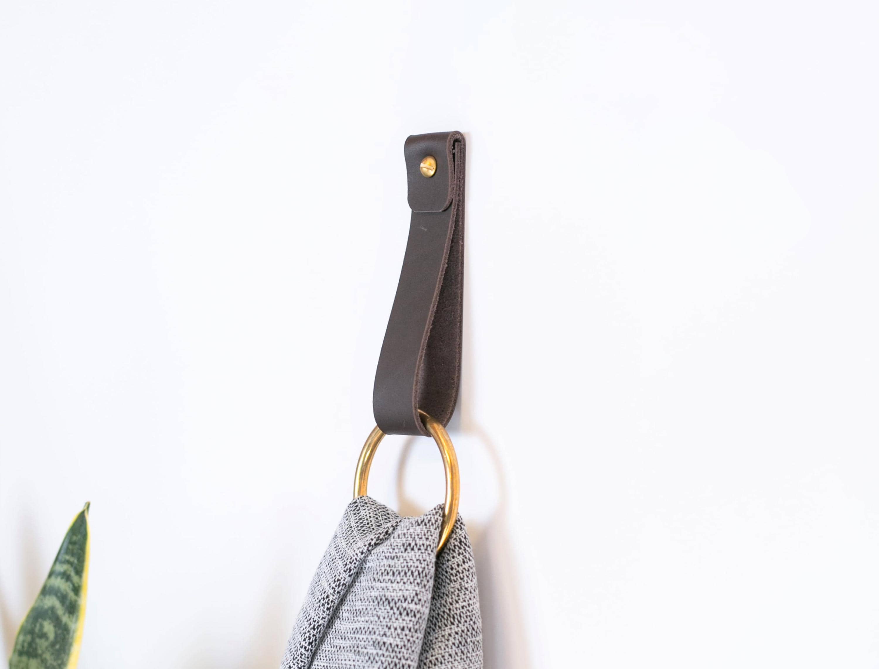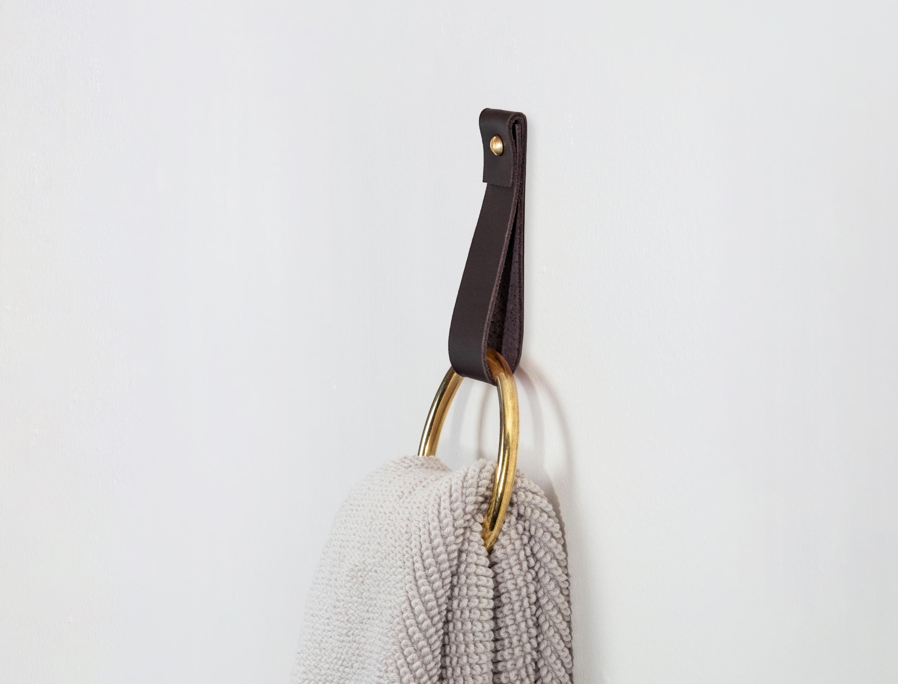 medium leather strap with brass towel ring minimalist hanger for ba...