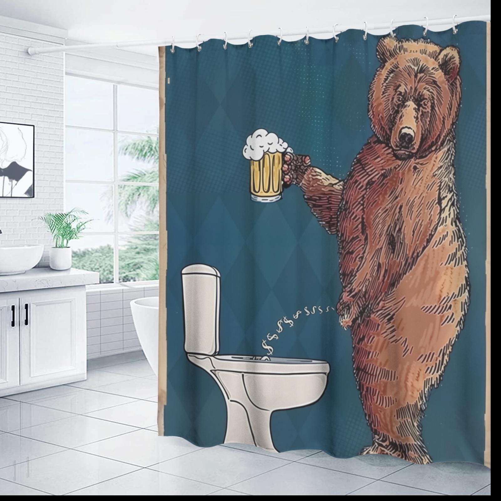 Funny Bear Shower Curtain, Cool Curtain Set for Bathroom, Bear Drin...