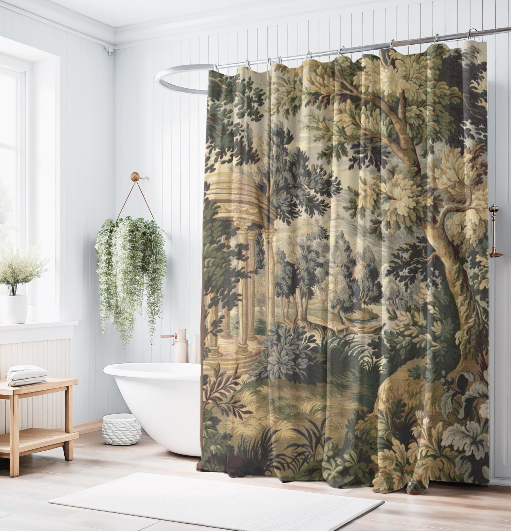 "VERDURE SPLENDOR: FRENCH LANDSCAPE SHOWER CURTAIN A Gobelins Masterpiece Reimagined for Your B...