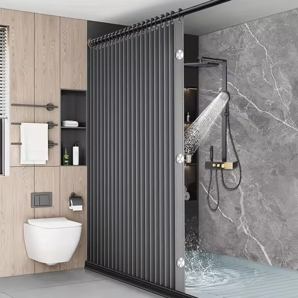 Modern single-layer foldable magnetic shower curtain with 14 hooks, easy to install bathroom partiti...