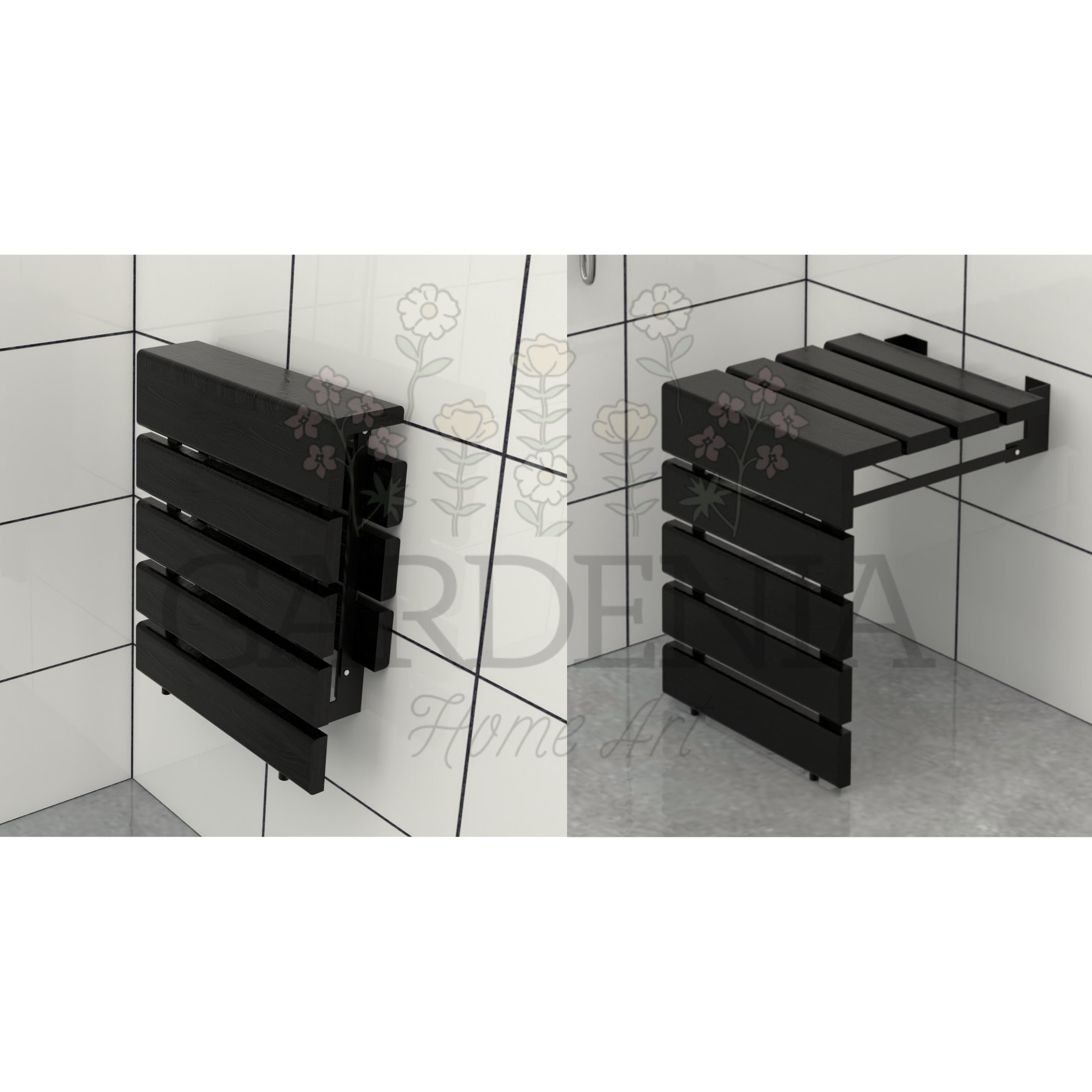 Wall-Mounted Natural Teak Wood Folding Black Shower Seat, Space-Sav...