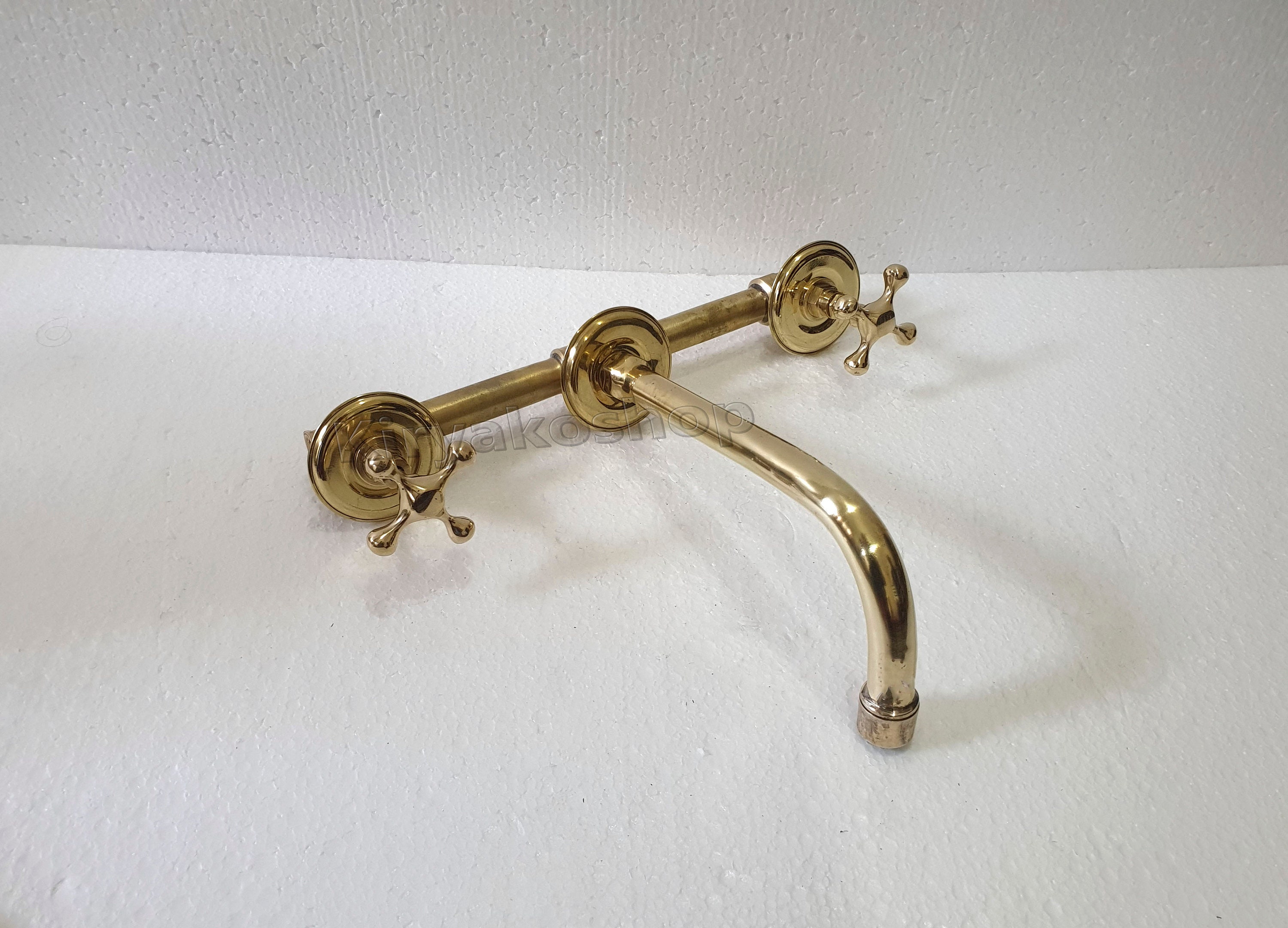 "Unlacquered Brass Wall Mounted Bathroom Kitchen Faucet With Two Cross Handles Farmhouse Faucet...