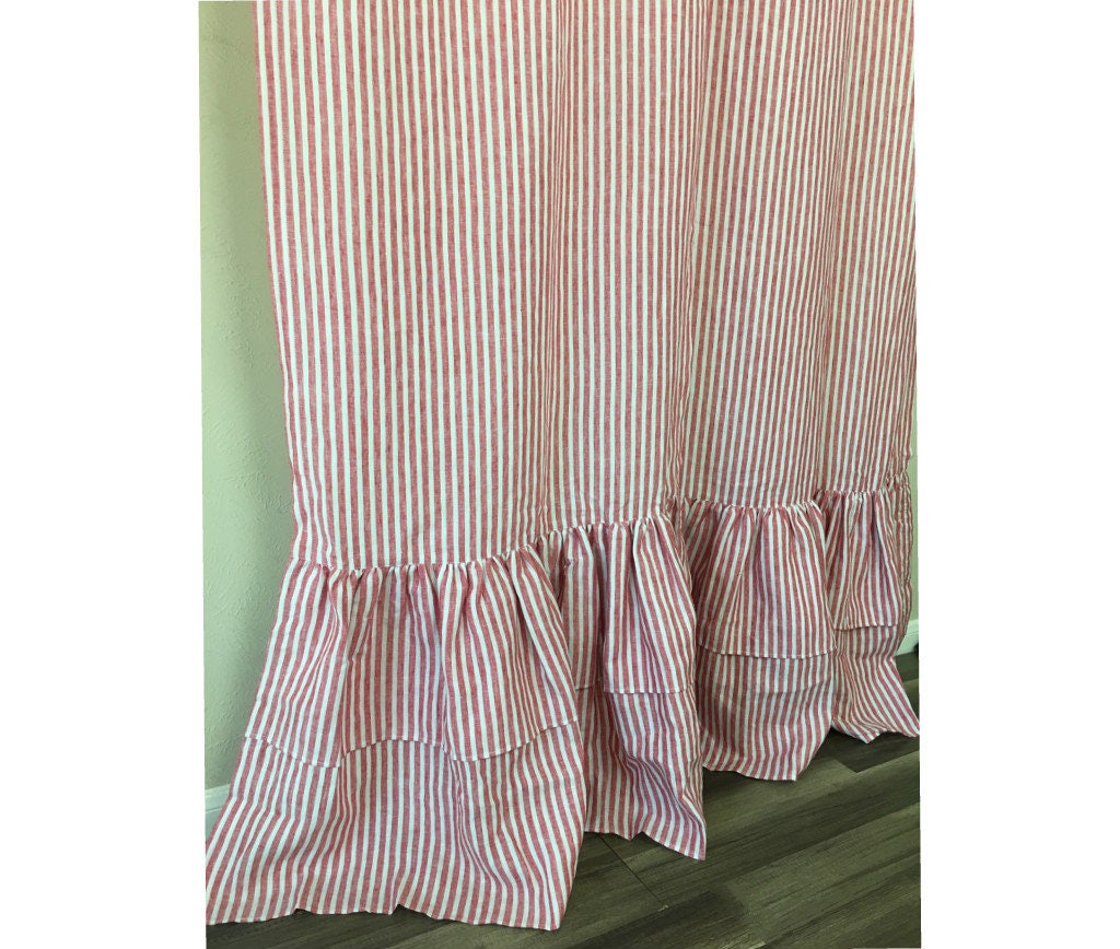 Red and White Striped Shower Curtain with 2-Tiered Mermaid Long Ruf...