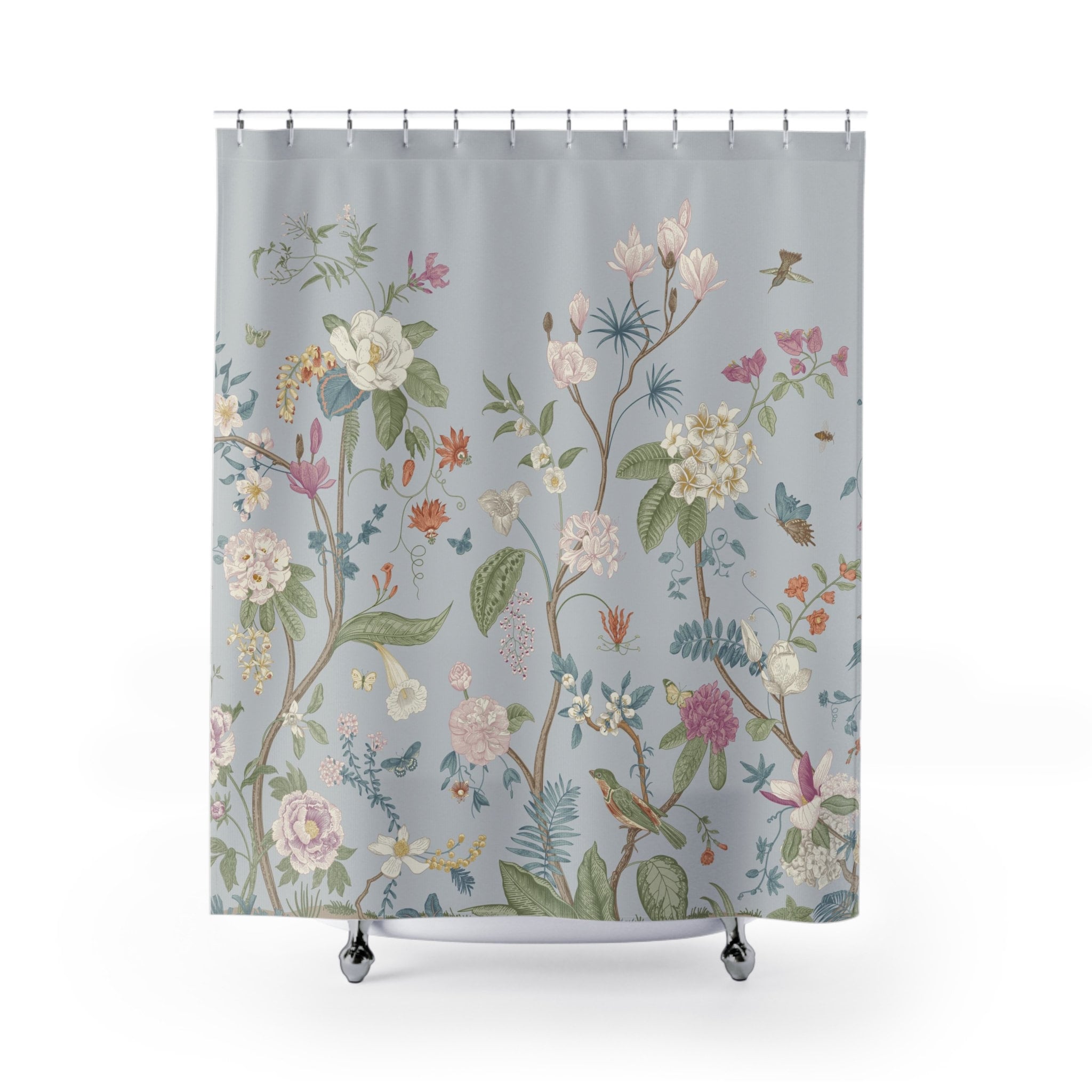 Chinoiserie Shower Curtain | Vintage Floral Bird Garden Fresco | Li...