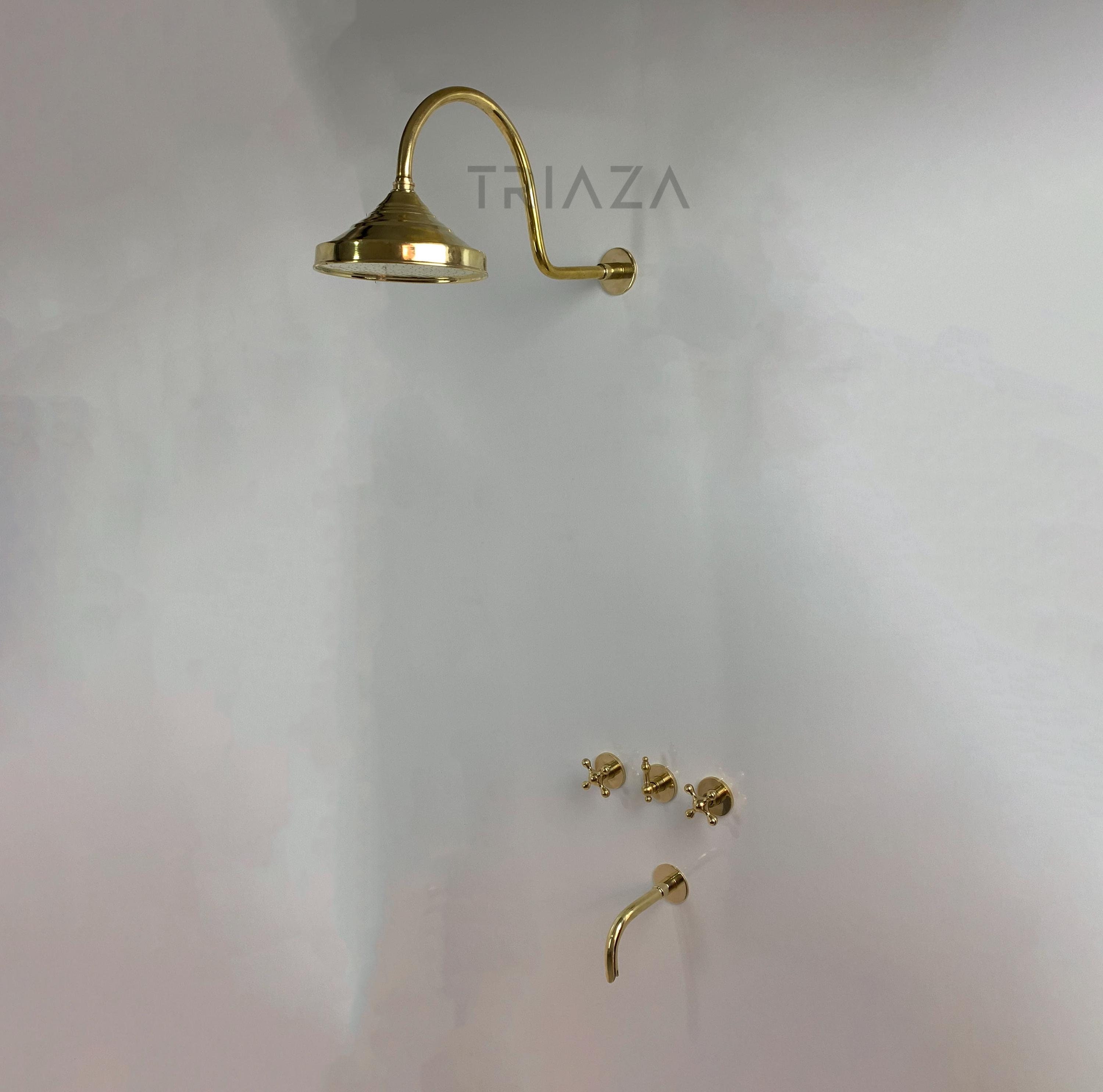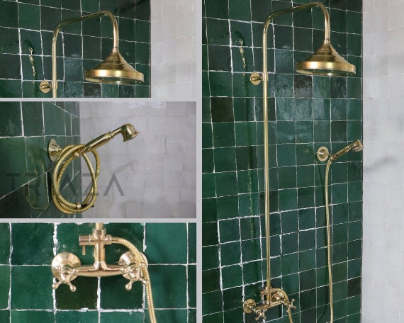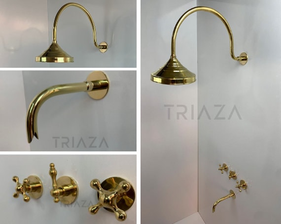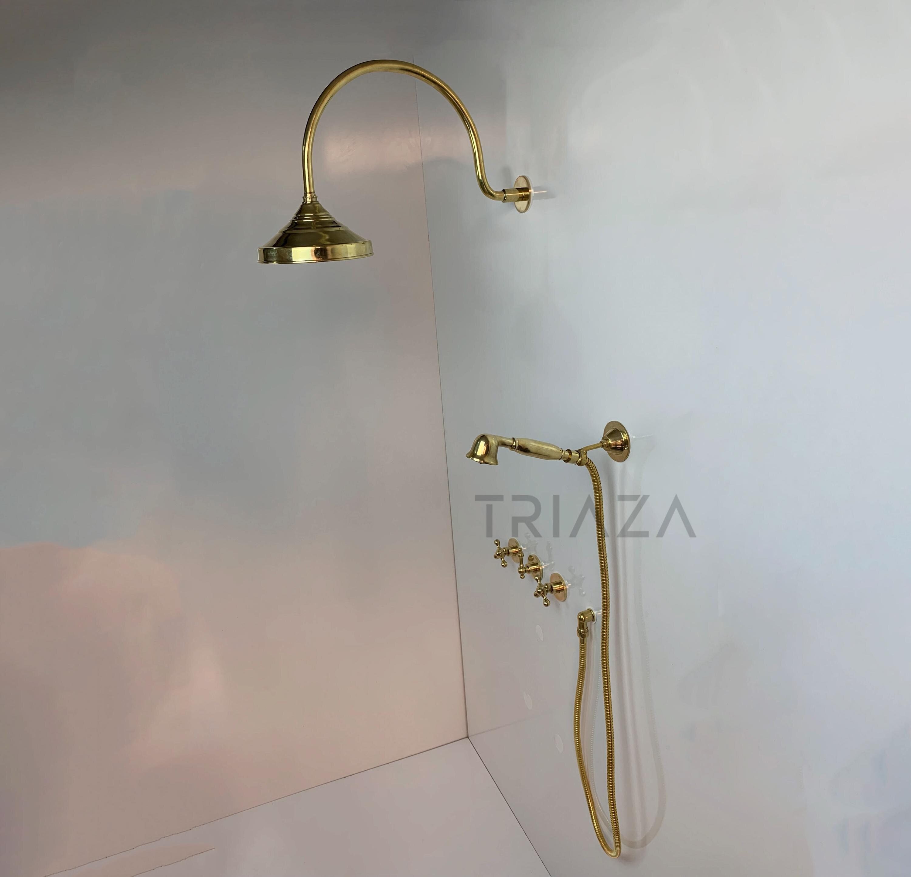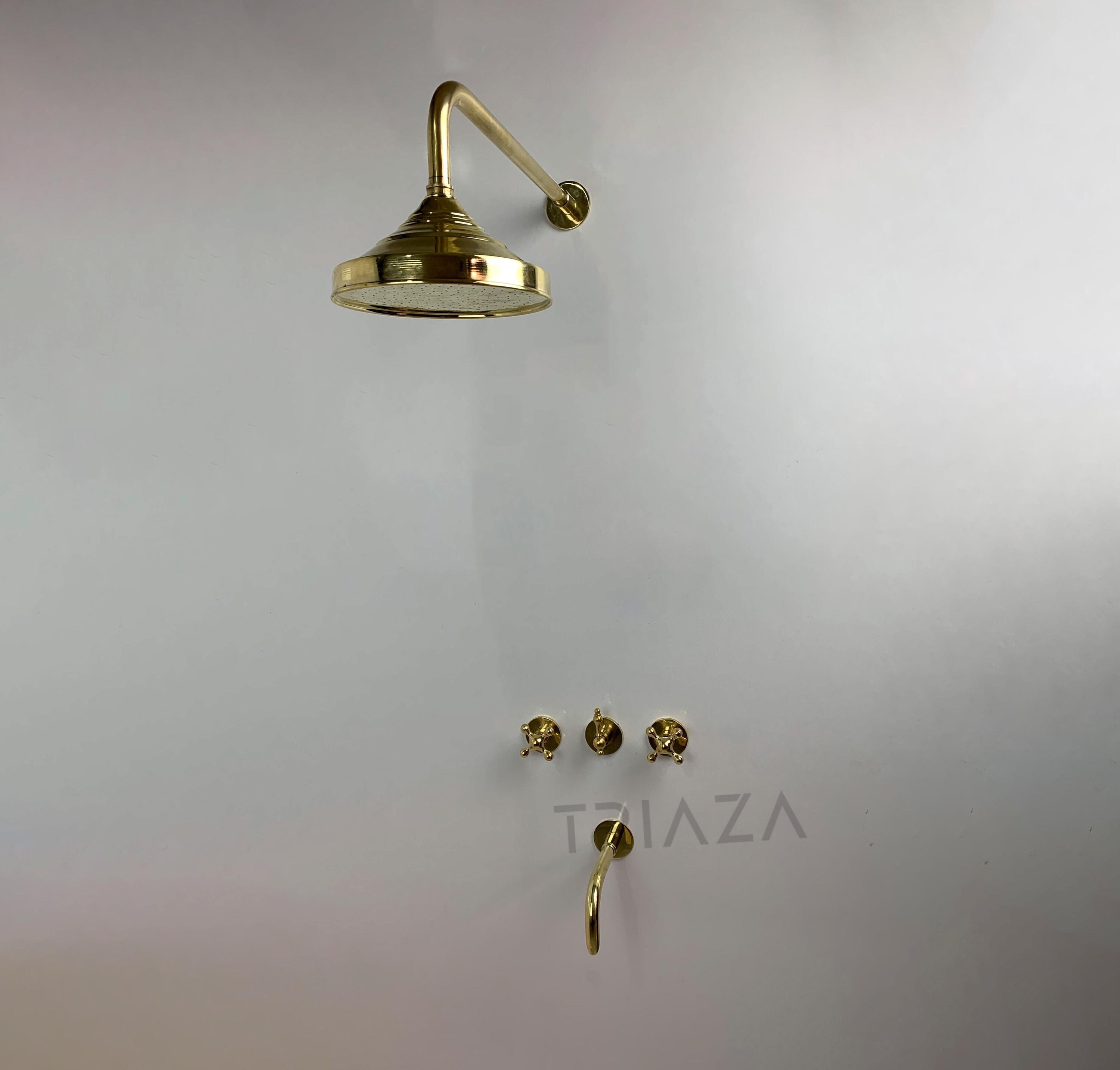 "Transform your bathroom into an oasis of luxury with Unlacquered Brass Wall Mounted Shower Sys...