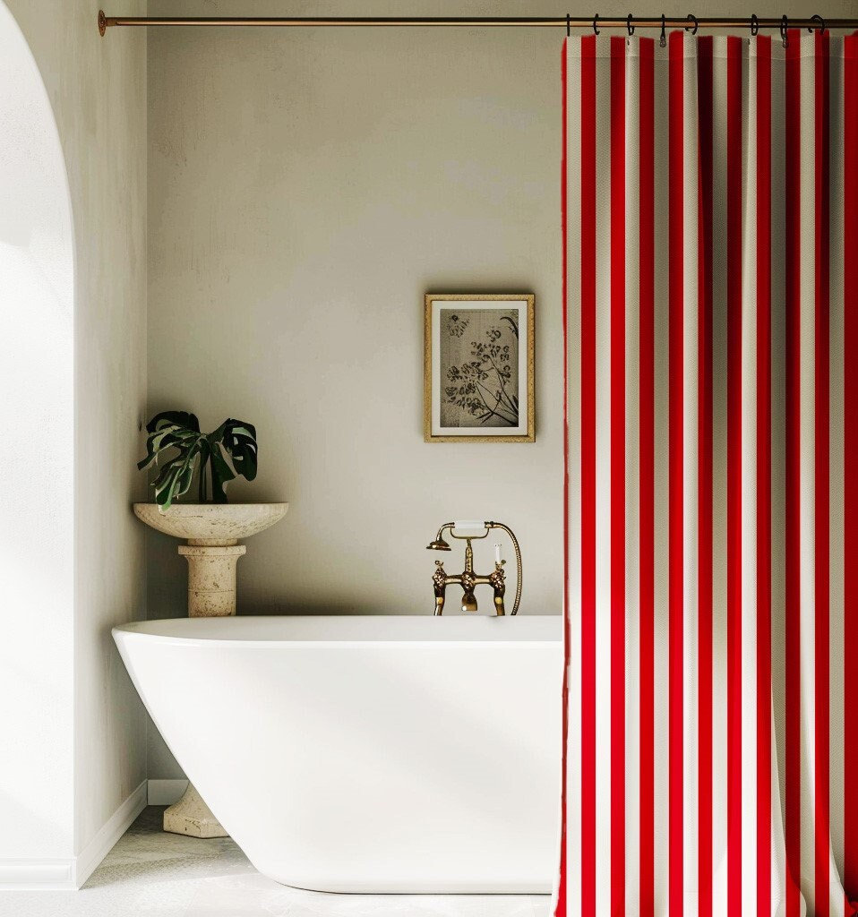 "Shower curtain red and white striped, the perfect maximalist bath curtain to elevate your bath...