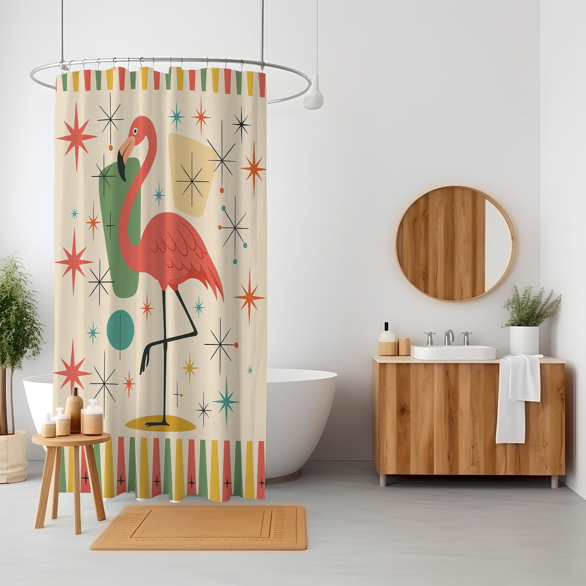 Add vintage flair to your bathroom with this mid-century modern flamingo shower curtain! Perfect for...