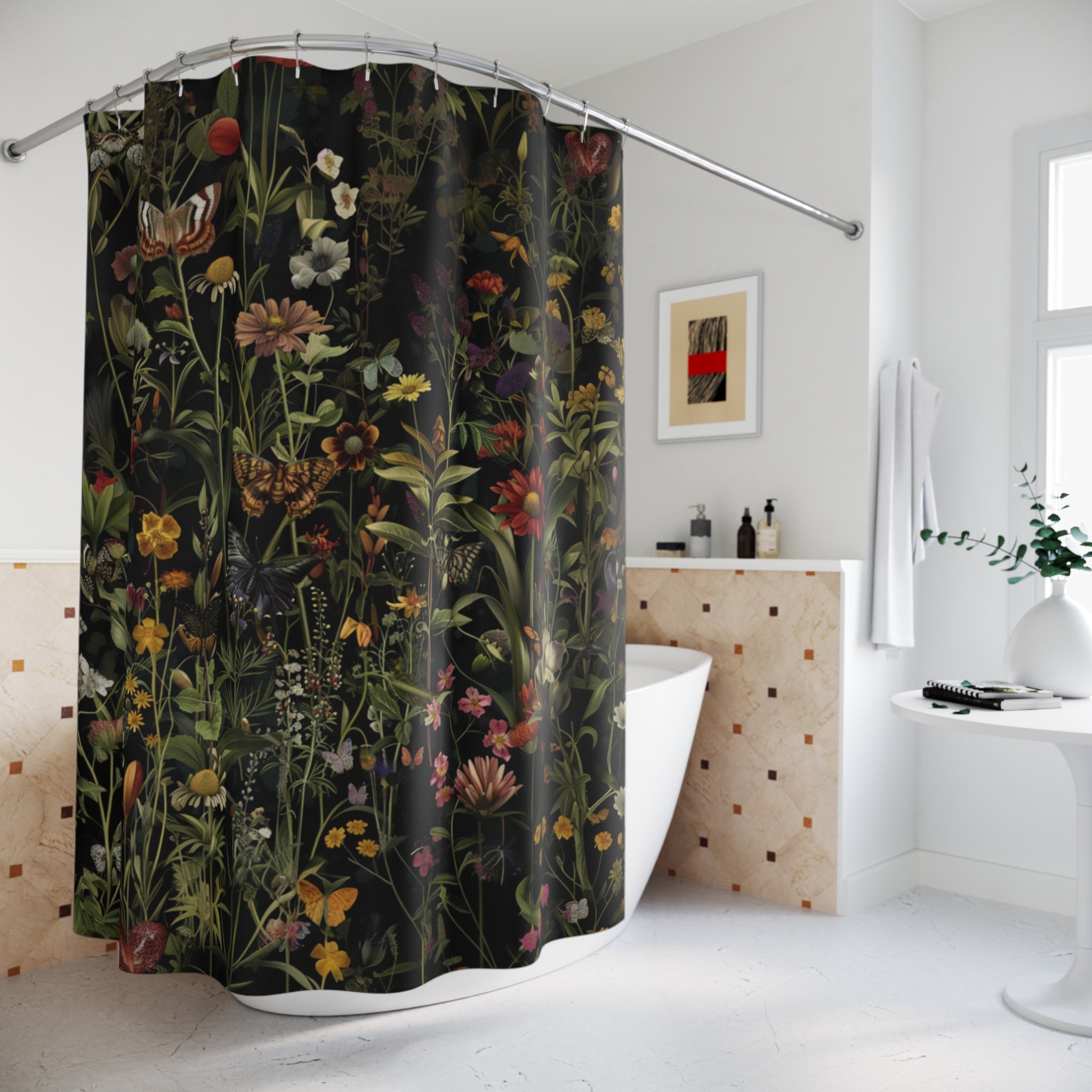 Dark Botanical Wildflower Shower Curtain | Flowers, Butterflies, Leaves | Gothic Floral Home Decor |...