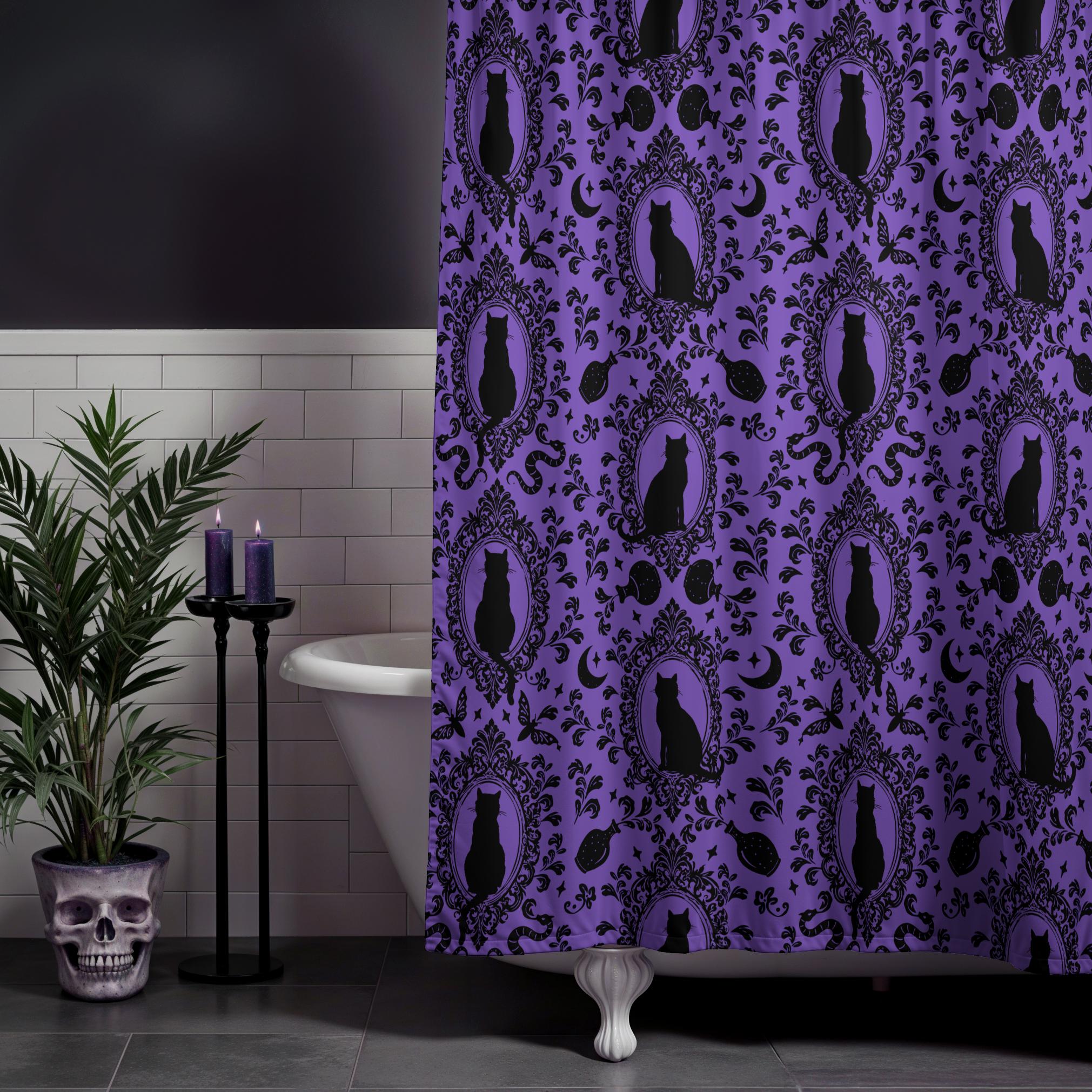 Gothic Cat Shower Curtain, Baroque Kitty Cameo Bathroom Decor in Bl...