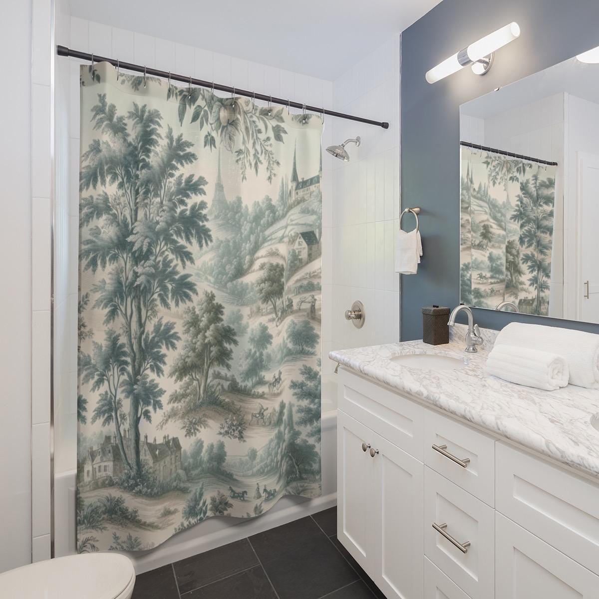 Toile Shower Curtain, Vintage French Country Bathroom Decor, Elegan...
