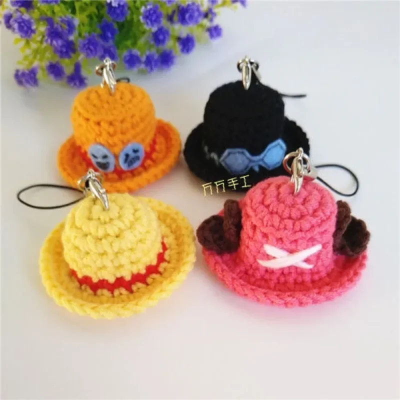 New anime cartoon knitted handmade One Piece Luffy Ace Sabo Chopper small hat straw hat keychain pen...