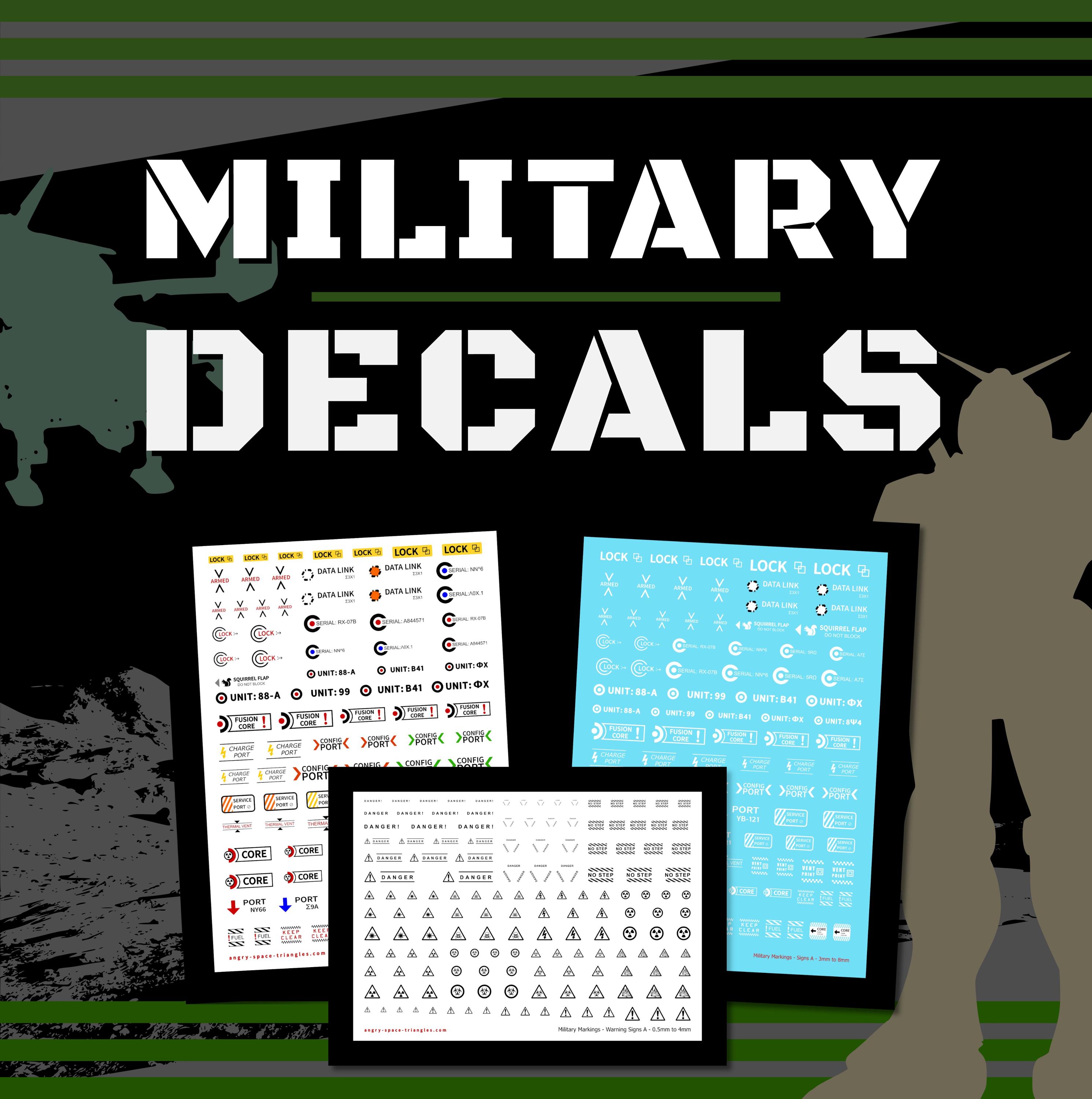 This listing is for sheets of military themed decals for use on Gundam, Vehicles, ships Robots etc. ...