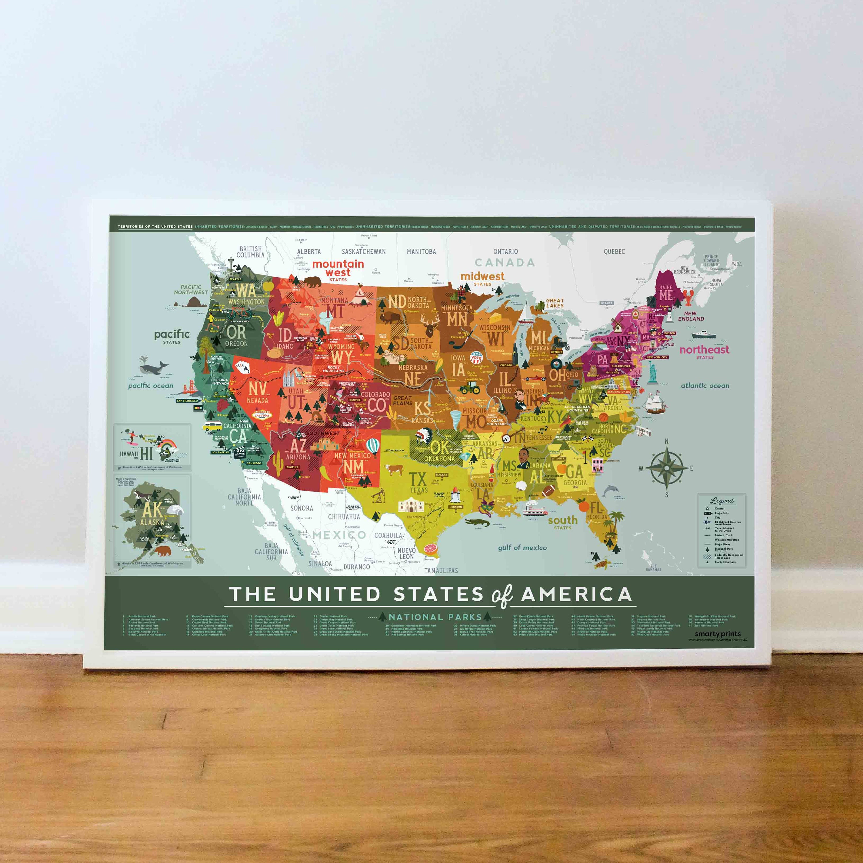 Educational Children's US Map, Fun Illustrated Map, US National Par...