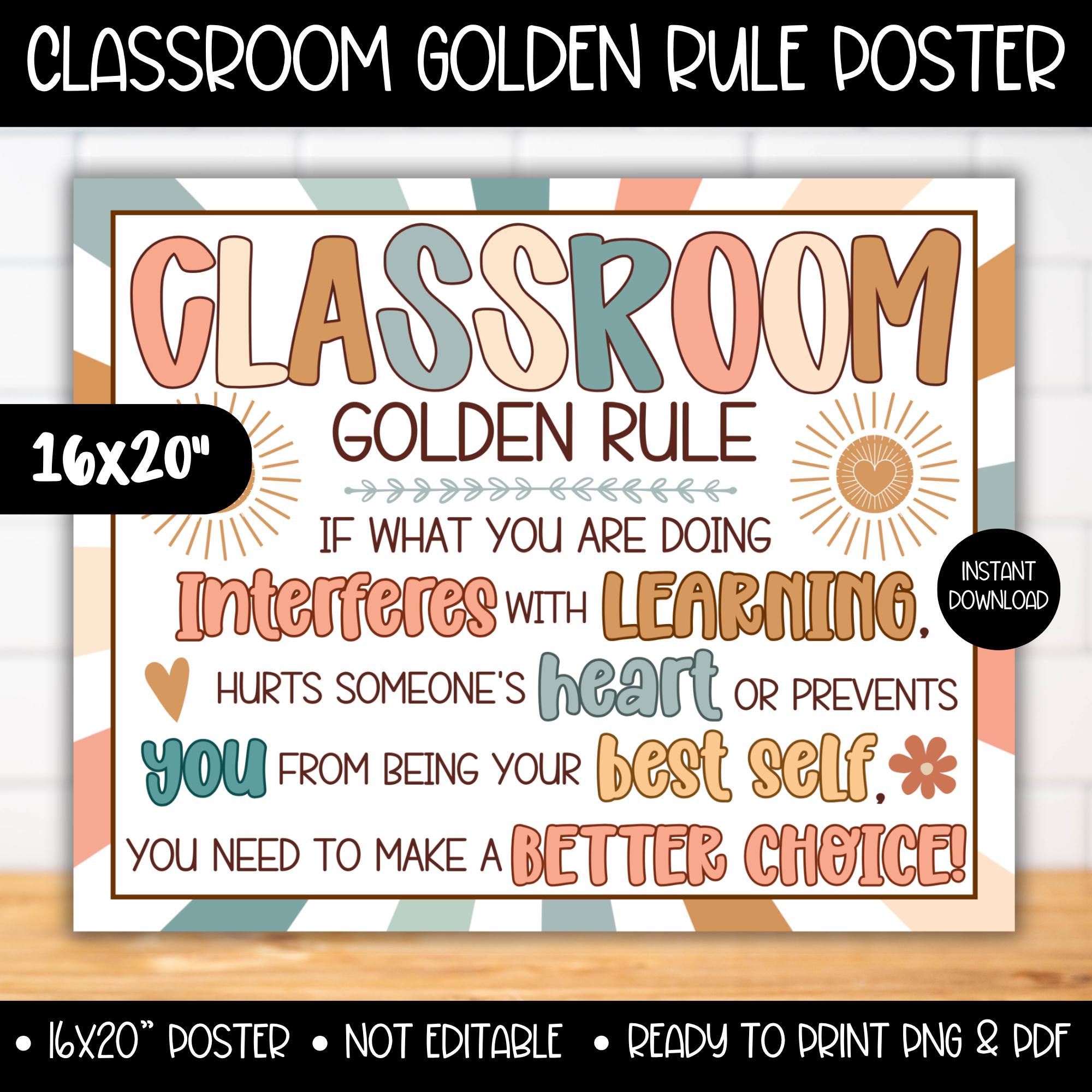 "Boho Classroom Golden Rule Poster, Elementary Class Rules Sign, Preschool Behavior Expectation...