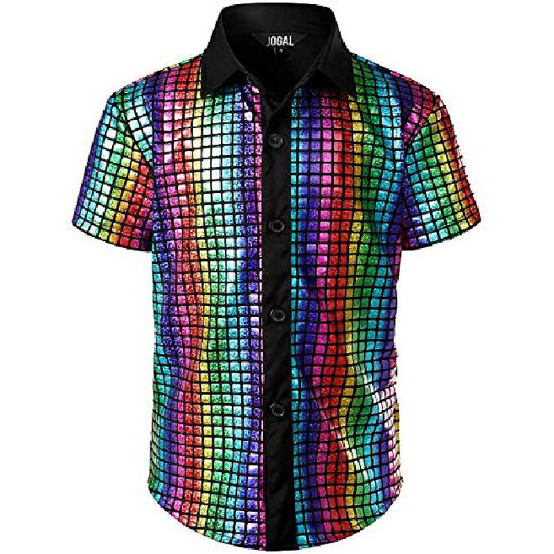 Mens 70s Disco Shirts Metallic Sequins Short Sleeve Button Down Shi...