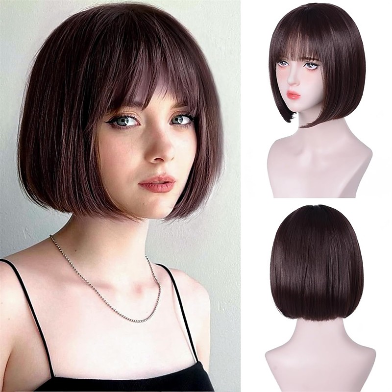 Short Brown Bob Wig With Bangs Straight Bob Wigs for Women Brown Bo...