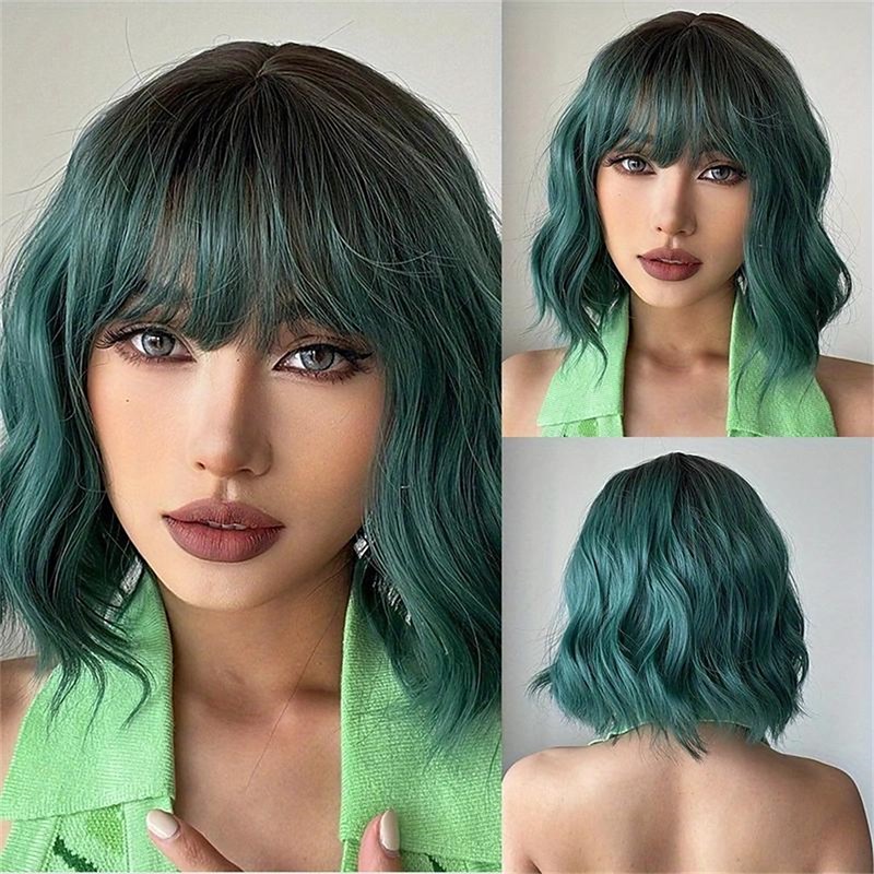 Blue Short Wavy Curly Hair Wigs With Bangs 14 Inch Synthetic Fiber ...