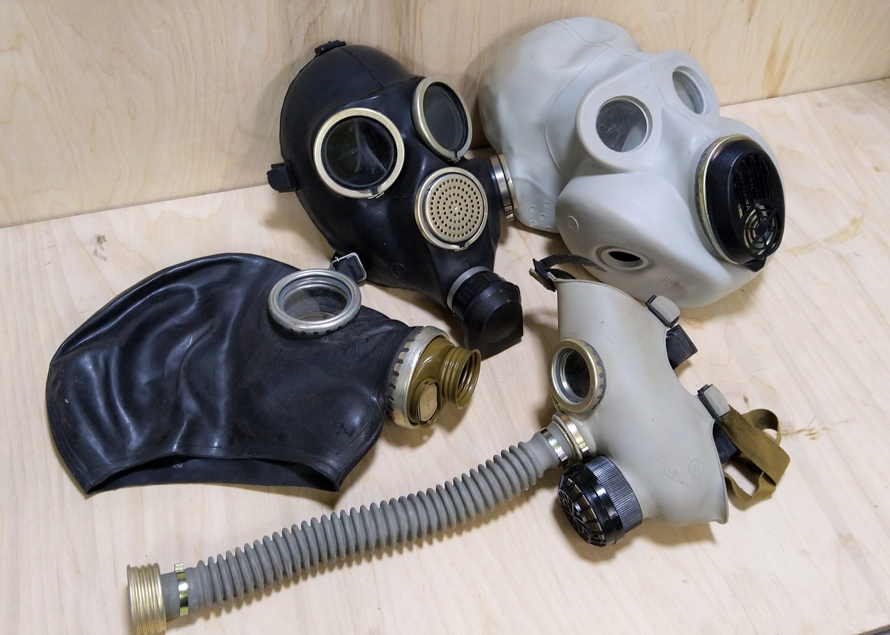 Set of 4 vintage rubber gas masks: gray/white PBF size 0 (XSMALL) or 1 (SMALL); black GP-5 size 0 XS...