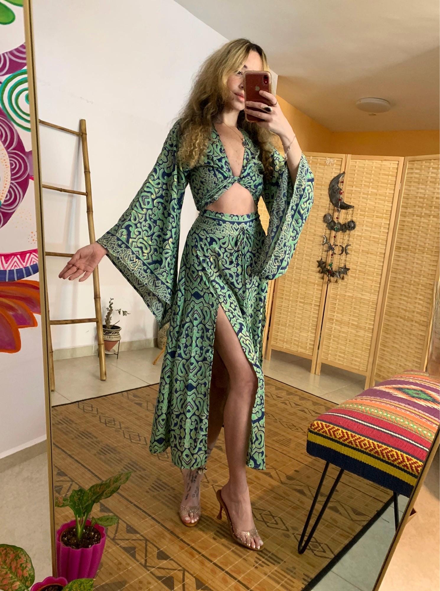 Double cut slit skirt and bell sleeve tie top boho set | goddess tw...