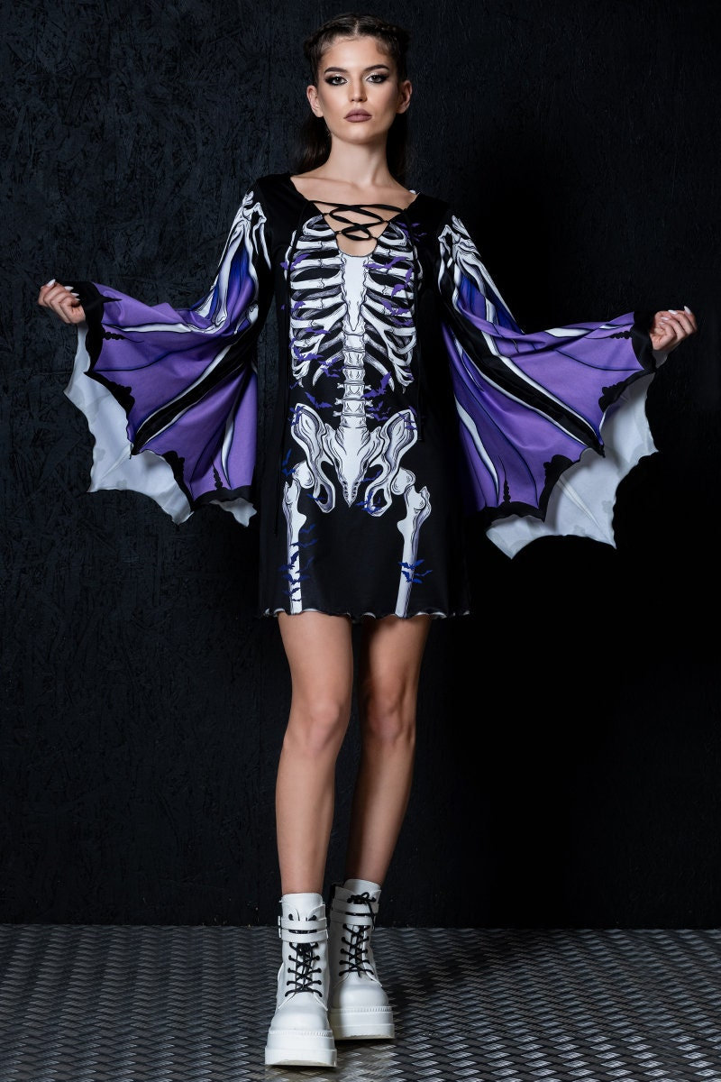 Bat Dress, Halloween Dress, Skeleton Dress, Flare Sleeve Dress, Lac...