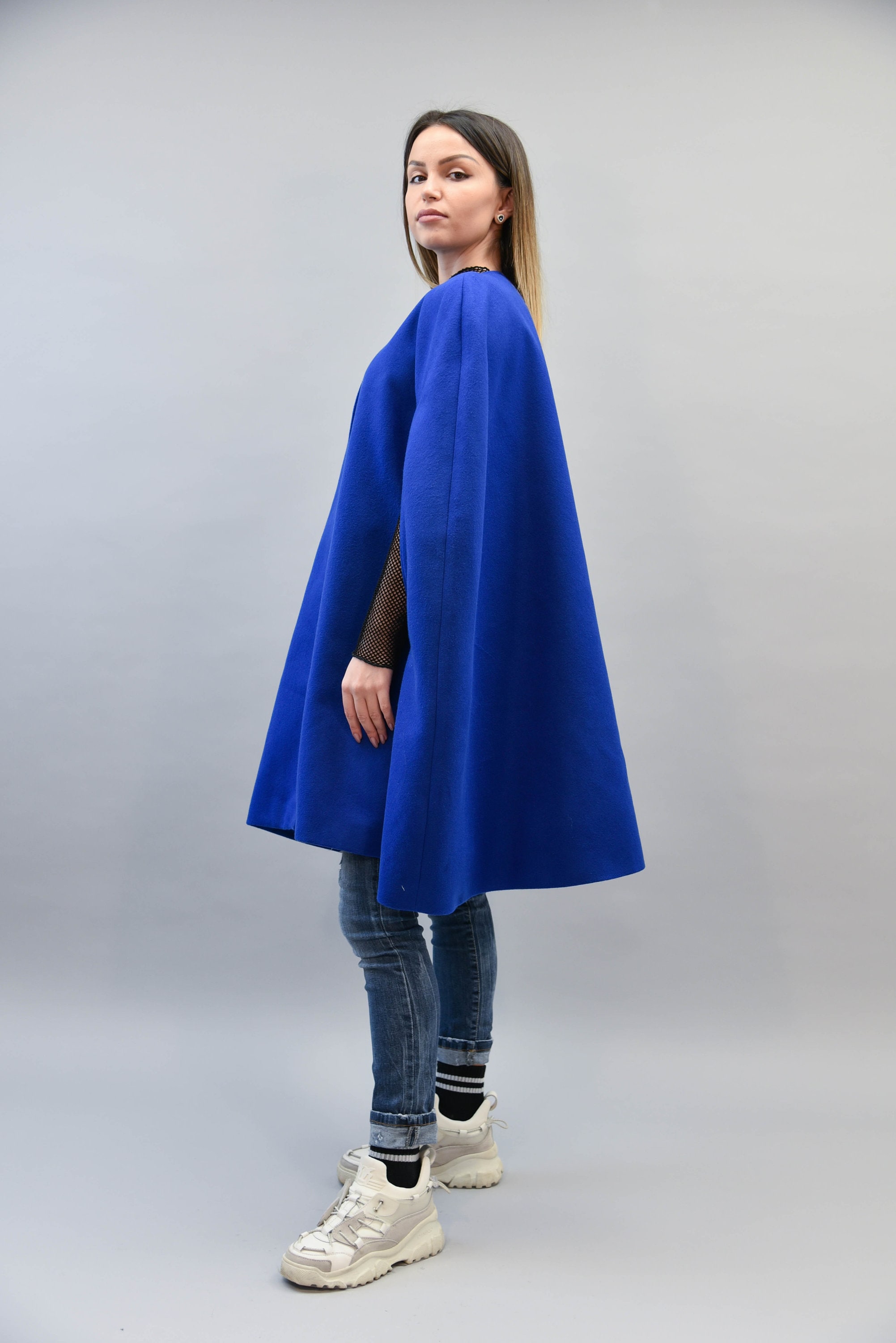 Outspread Cape Coat/Cashmere Blend Cape/Wool Blue Cape/Cape Jacket/...