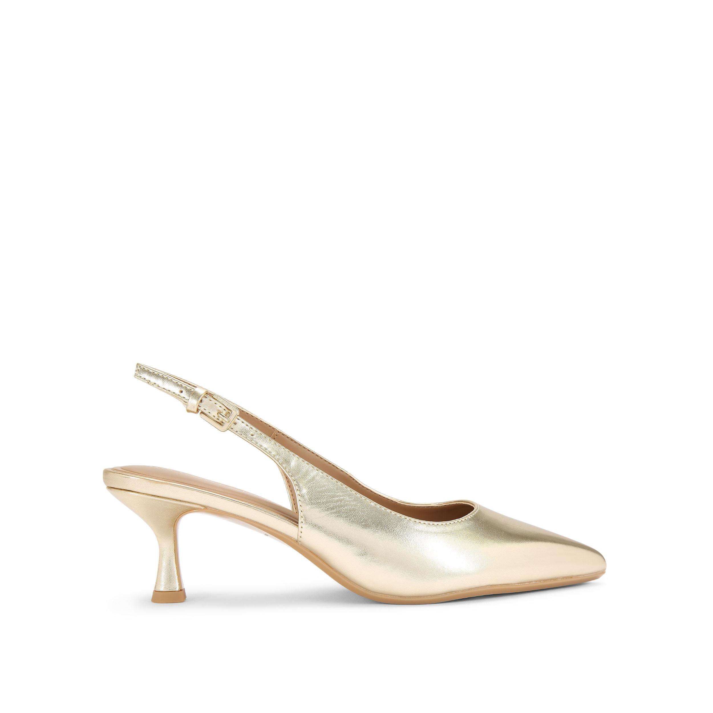 The Tilly is a slingback heel crafted from a gold metallic synthetic leather. The toe is pointed and...