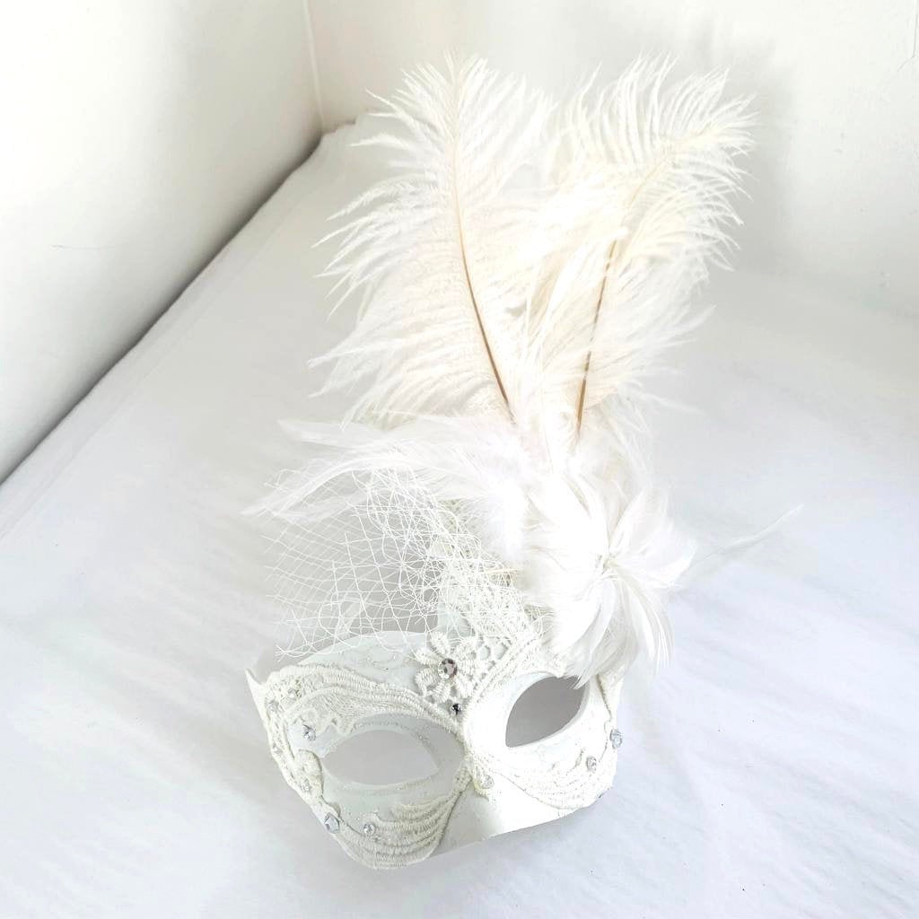 white wedding mask for women with glitter and feathers. Easy to wear and remove! All Masks come with...