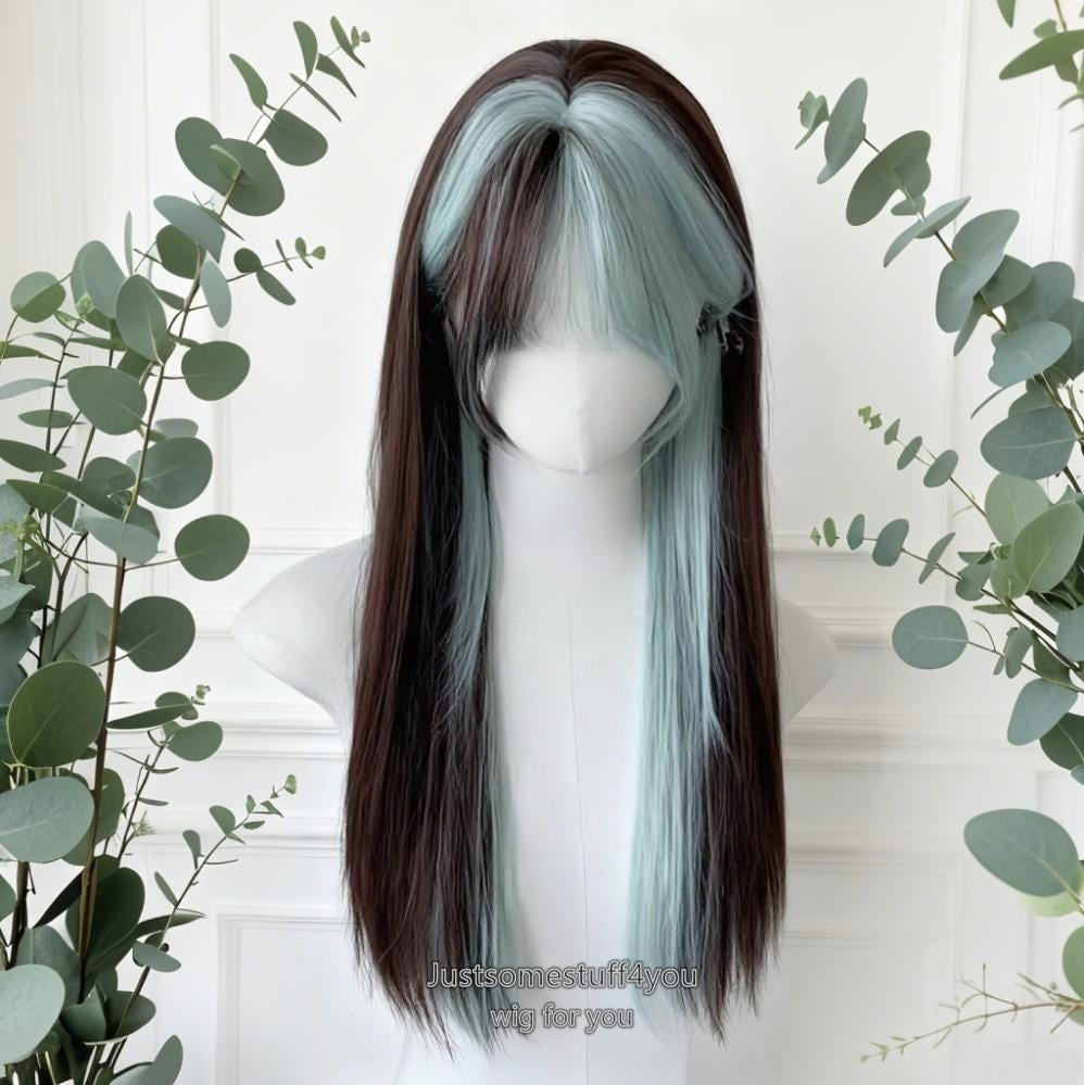 Blue Highlight Long Straight Wig with Bangs, Black Blue Straight Wi...