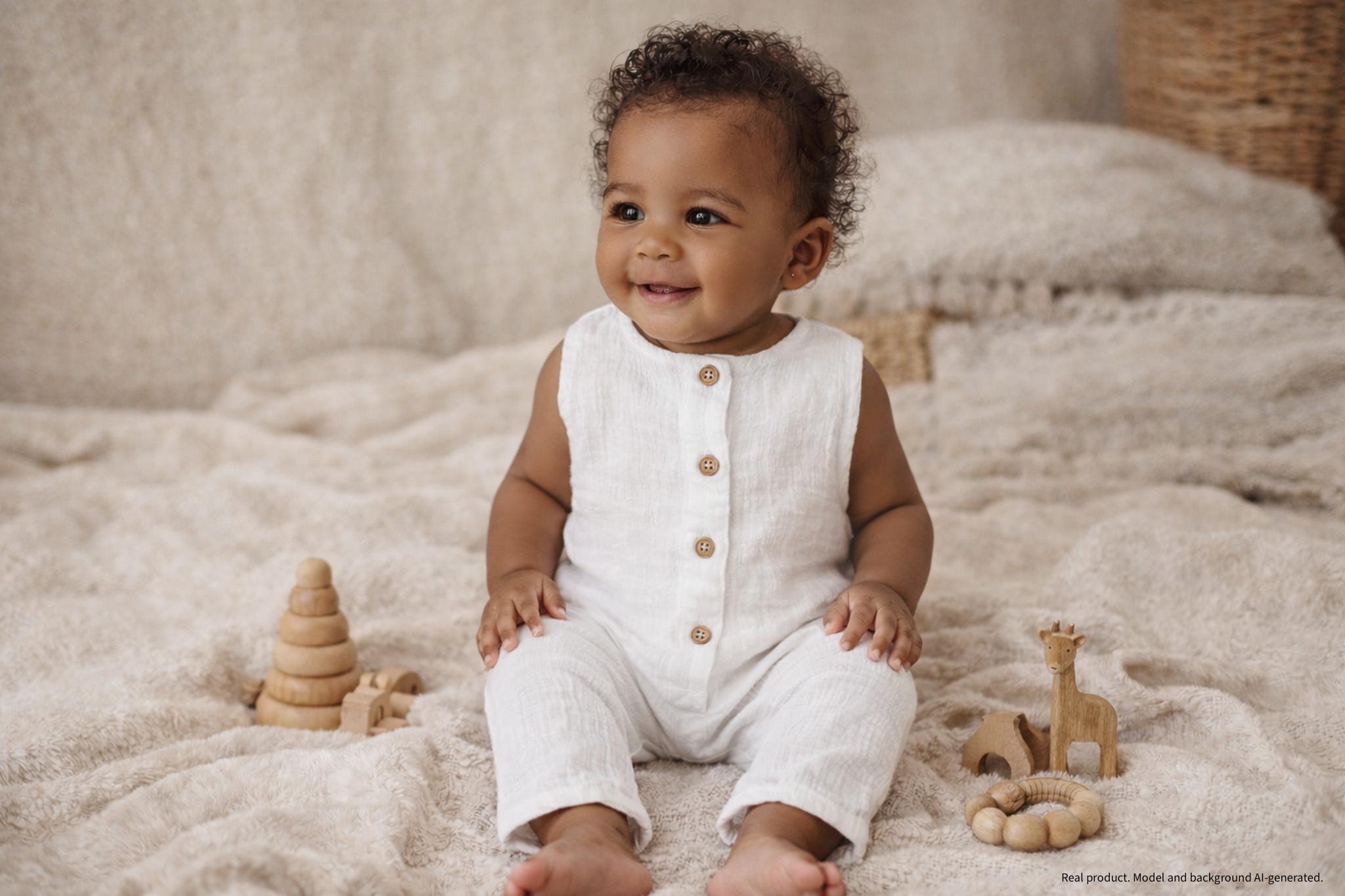 The offer includes a sleeveless baby girl muslin romper made of organic cotton. It fastens at the fr...