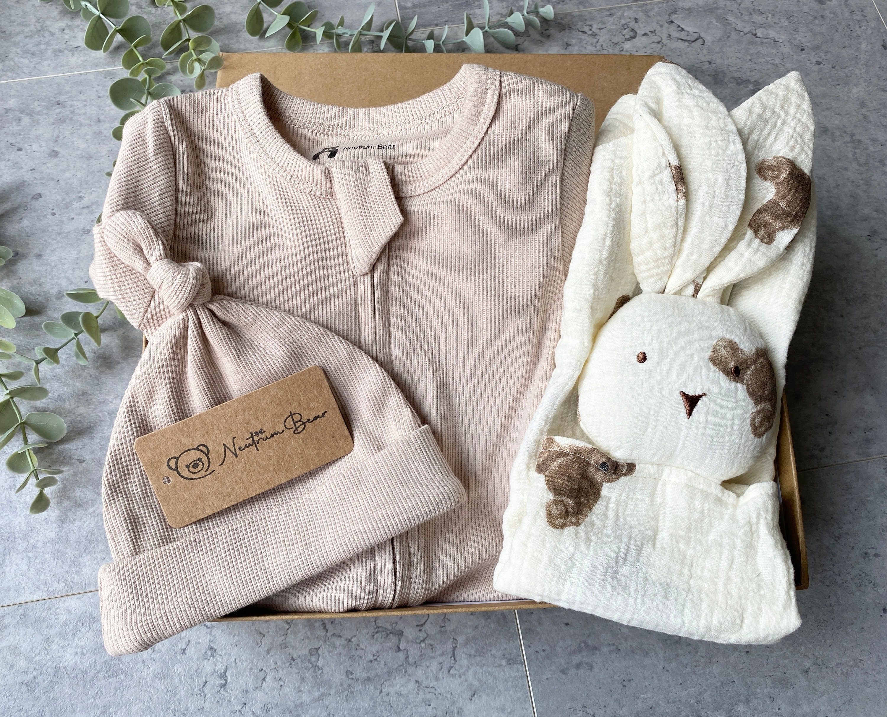 Beautiful Baby Gift consisting of three parent favourites - our Organic Sleepsuit & matching hat...