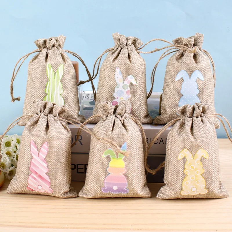 6pcs Easter Burlap Candy Bags Bunny Pattern Jute Linen Treat Gift B...
