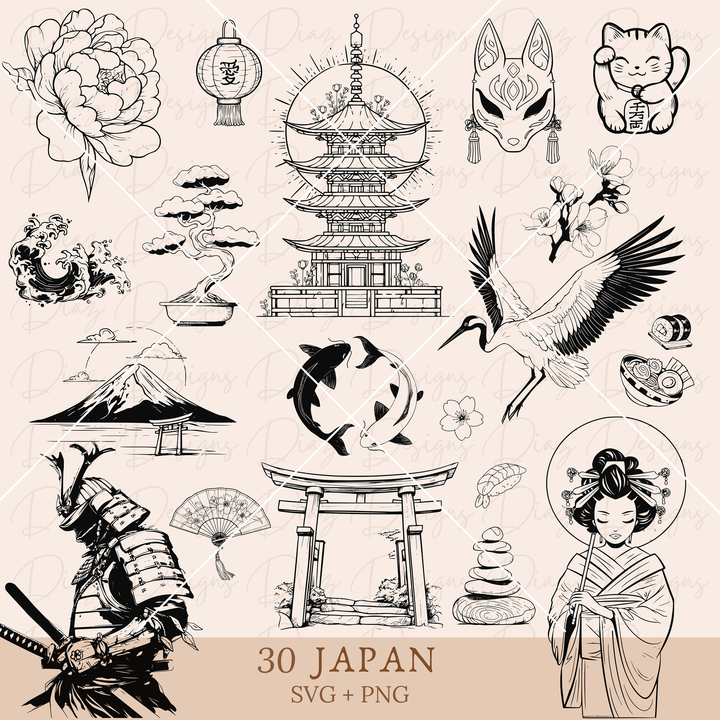 This is an instant digital download file. No physical item will be shipped. Set of 30 Japanese desig...