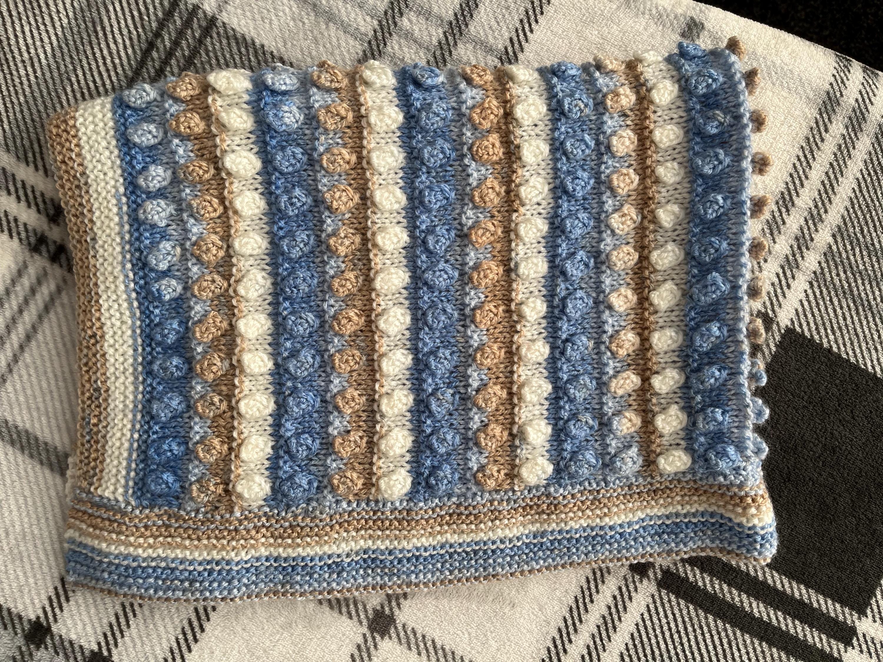 Hand Knitted Baby Blanket with Bobbles: Blue, Brown, and White (60c...