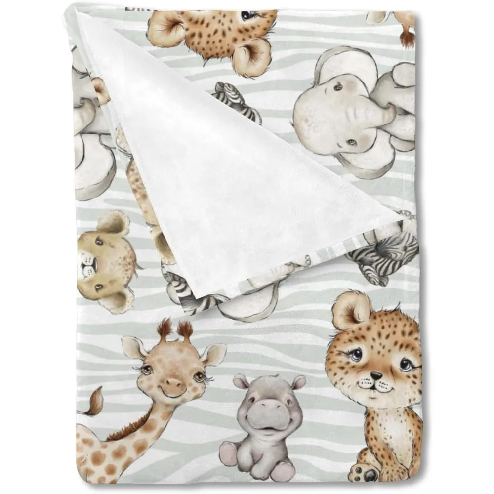 African Animal Baby Blanket, Newborn Boy Girl Shower Gift, Elephant Giraffe Lion Flannel Fleece, Nur...