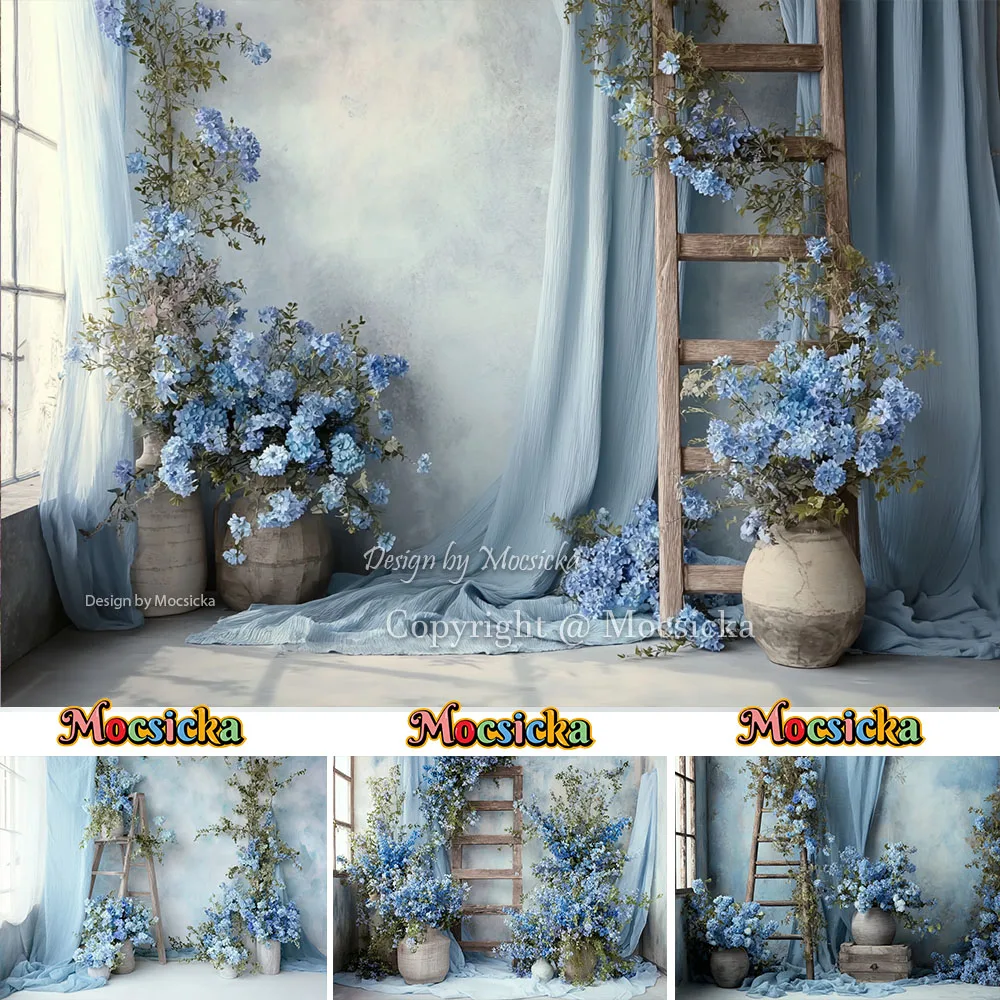 Mocsicka Maternity Portrait Backdrop Photography Blue Floral Curtains Window Ladder Background Decor...