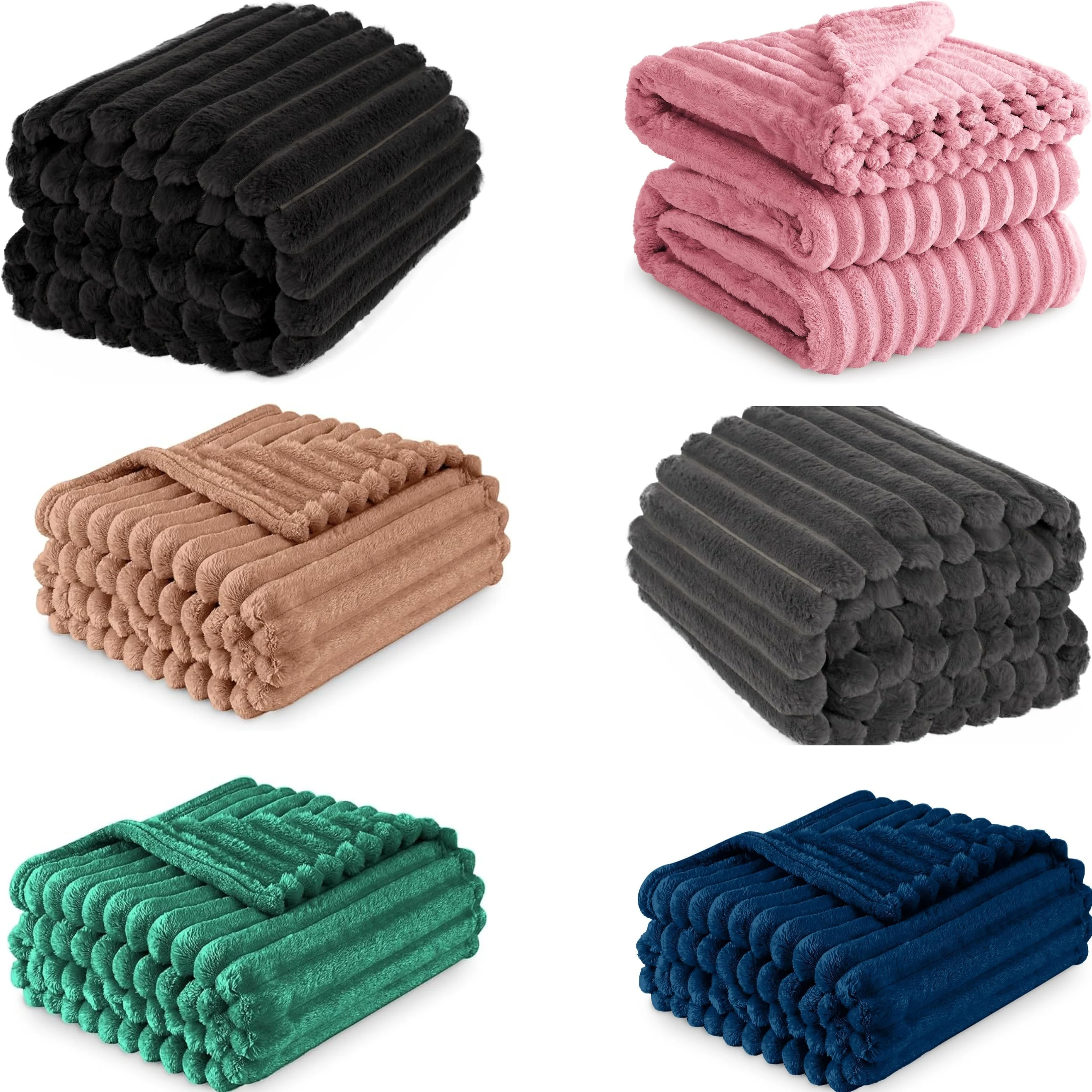 Large Teddy Fleece Throw Blanket Soft Fluffy Ribbed Sofa Bed Blanket Cozy Warm Reversible Decorative...
