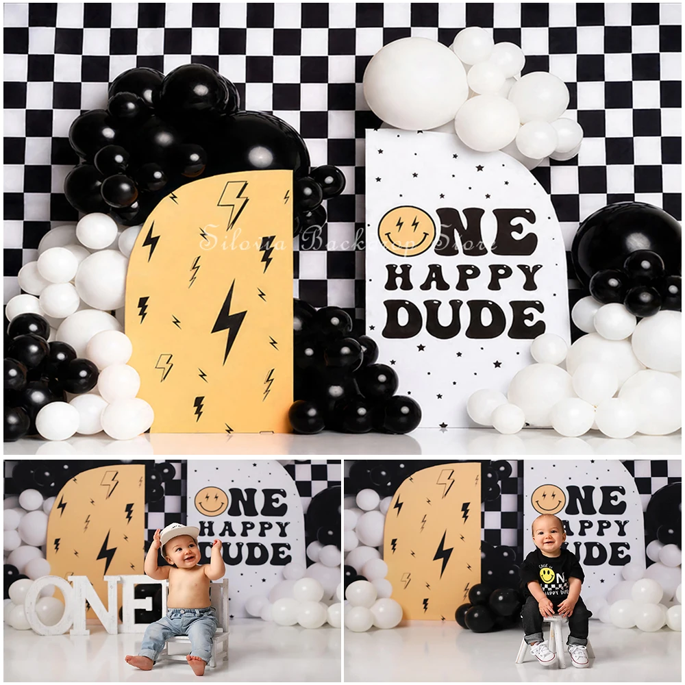 One Happy Dude Photo Background Kids Birthday Cake Smash Photo Studio Props Black and White Balloon ...