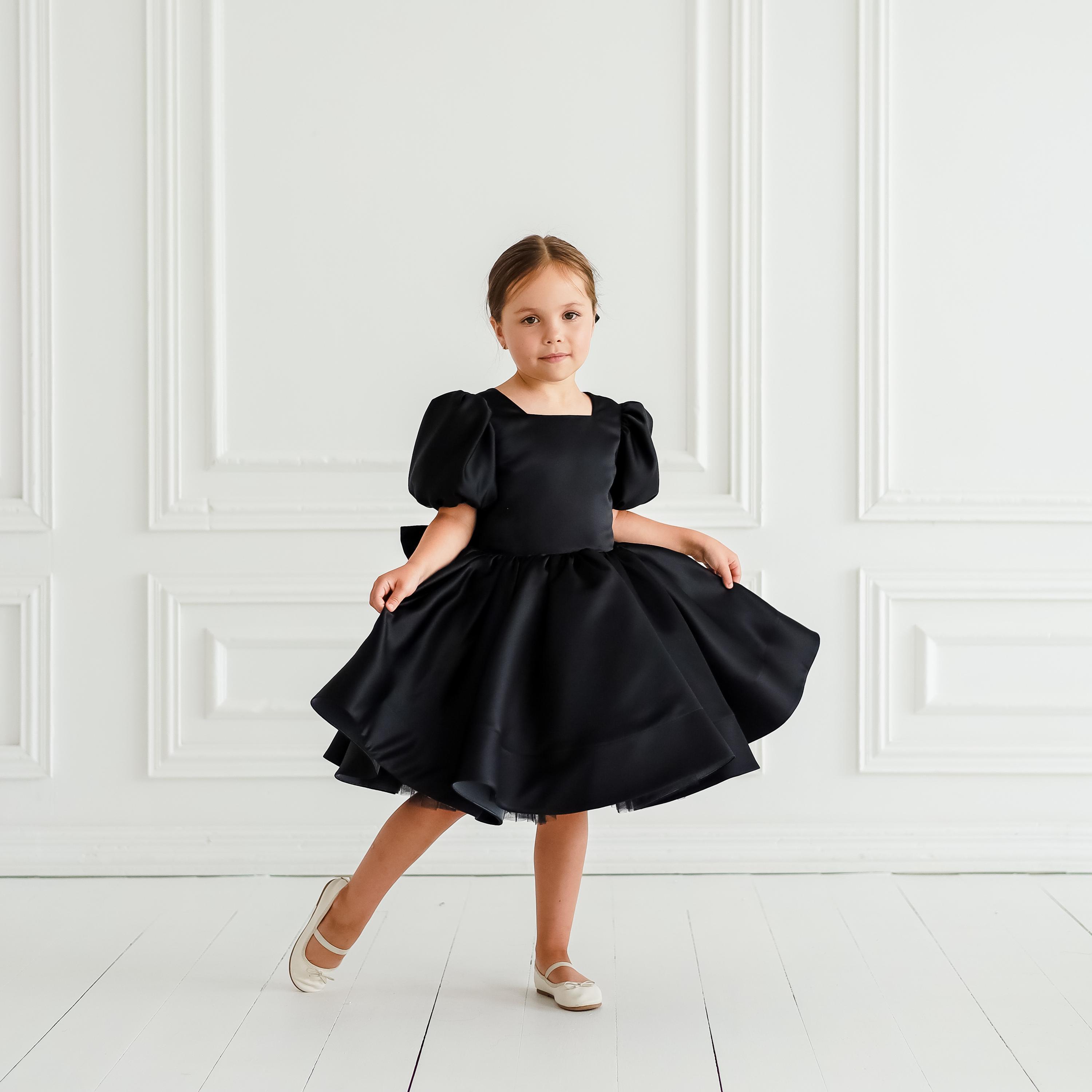 Black Satin Girl Dress, Big Bow Girl Dress, Fancy Toddler Dress, Bl...