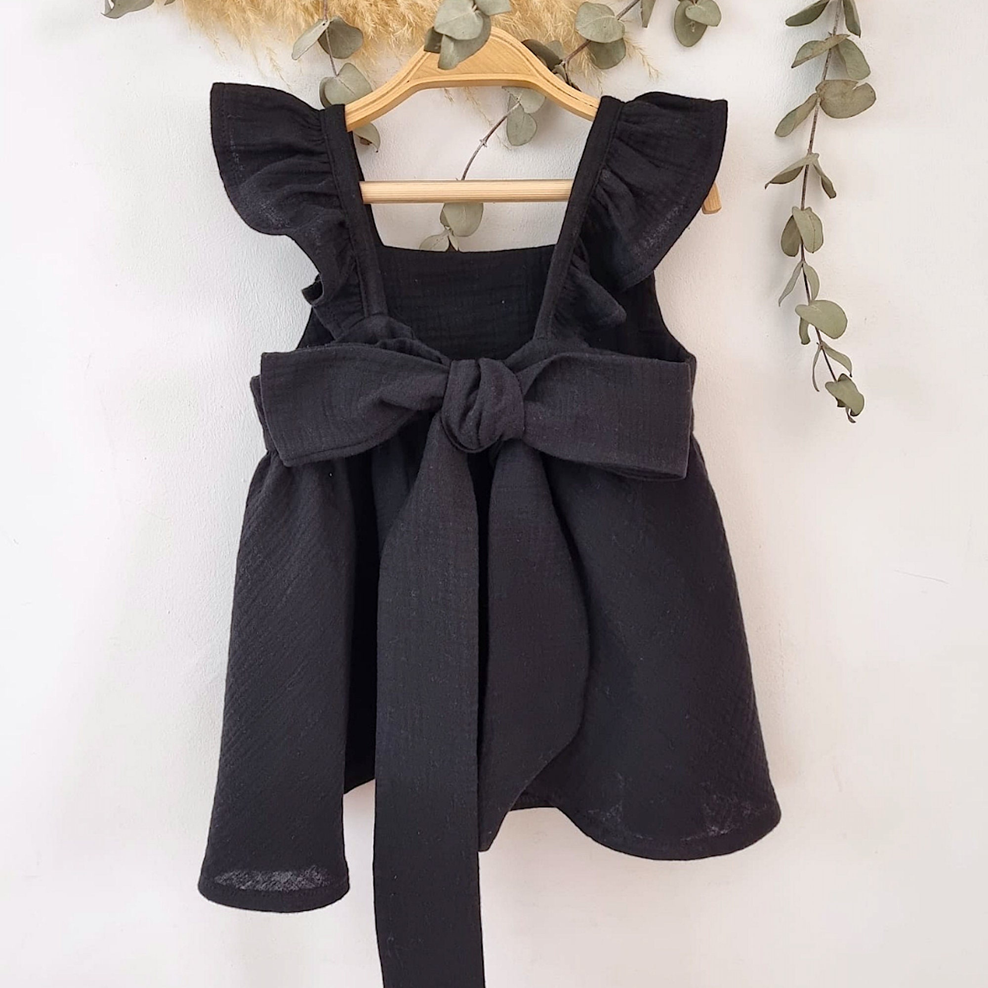 "Black dress for baby girls, organic cotton chiffon with boho style ruffled diaper cover, a per...